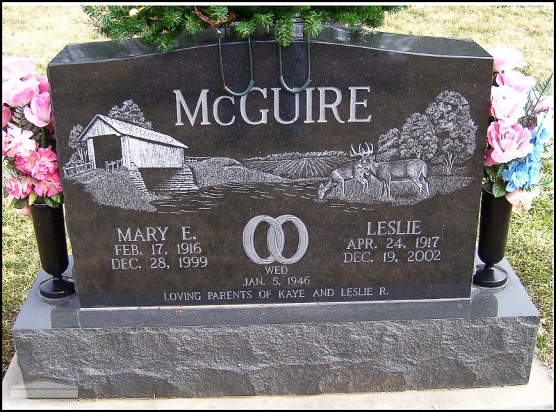 - Photo image of the headstone of Leslie and Mary McGuire in Scioto Burial Park located in Scioto County.
