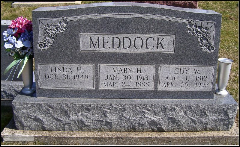 - Photo image of the headstone of Linda, Mary, and Guy Meddock in Prospect Cemetery located in Highland County.
