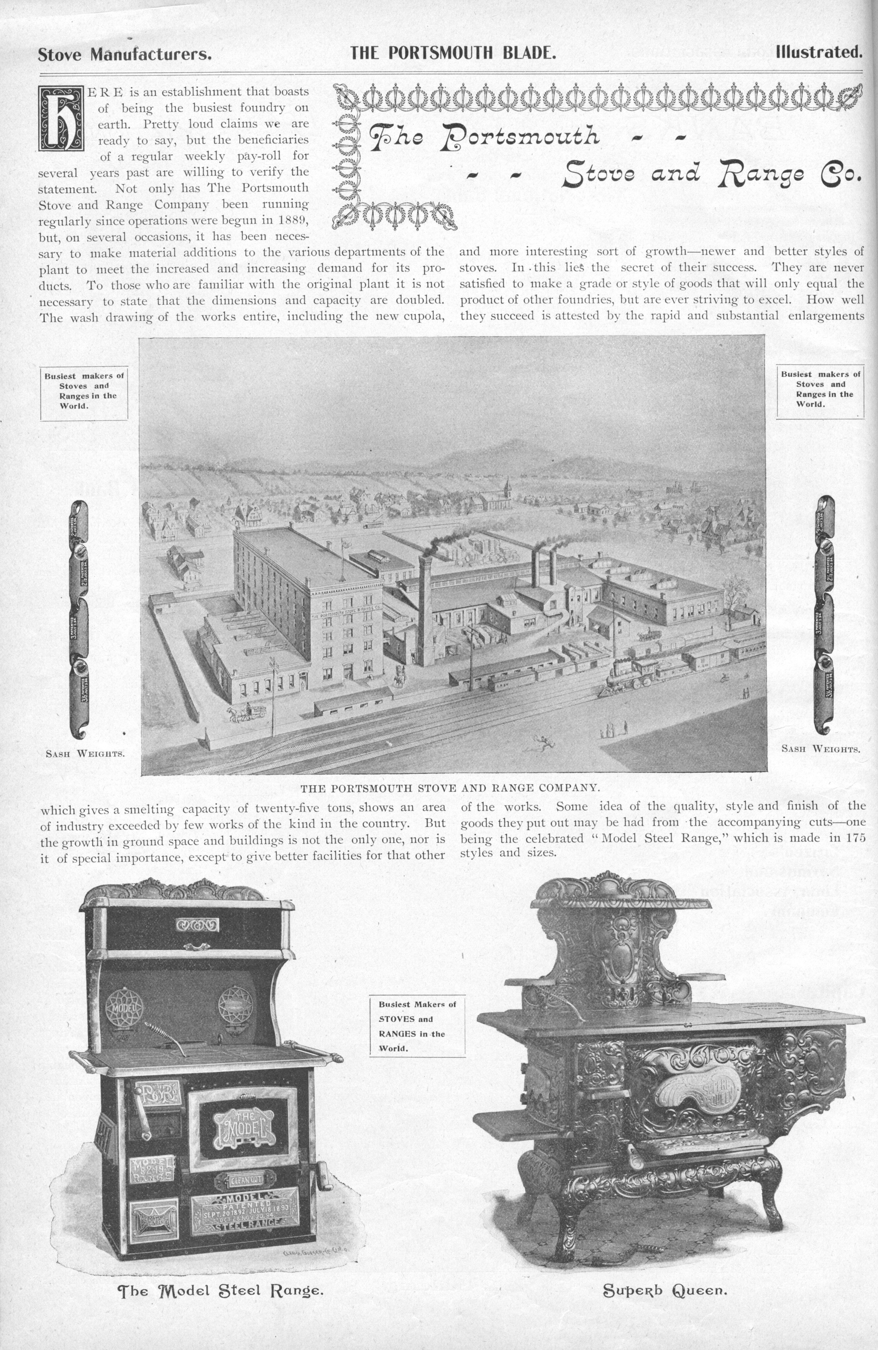 - Black & white illustrations of the factory and two ranges. The business, which began in 1889, is noted to be the "Busiest makers of Stoves and Ranges in the World"