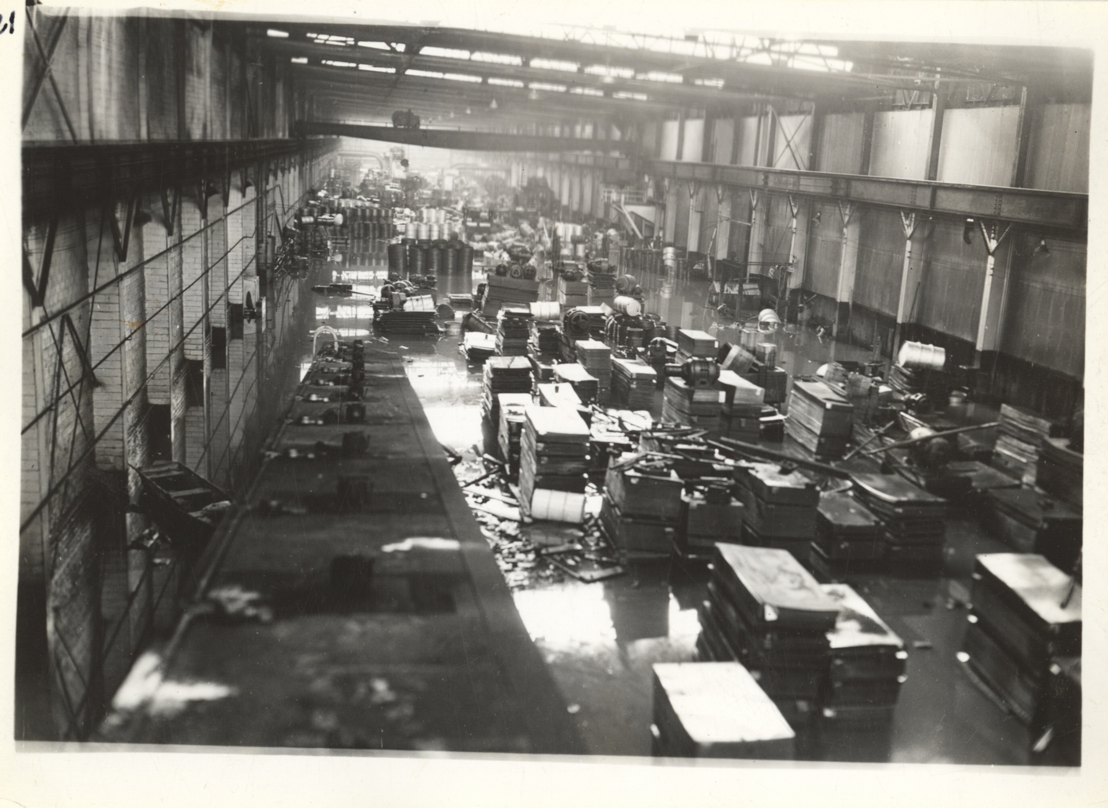 - Black & white photo looking west in the flooded barrel shop of the steel mill in New Boston in 1937.