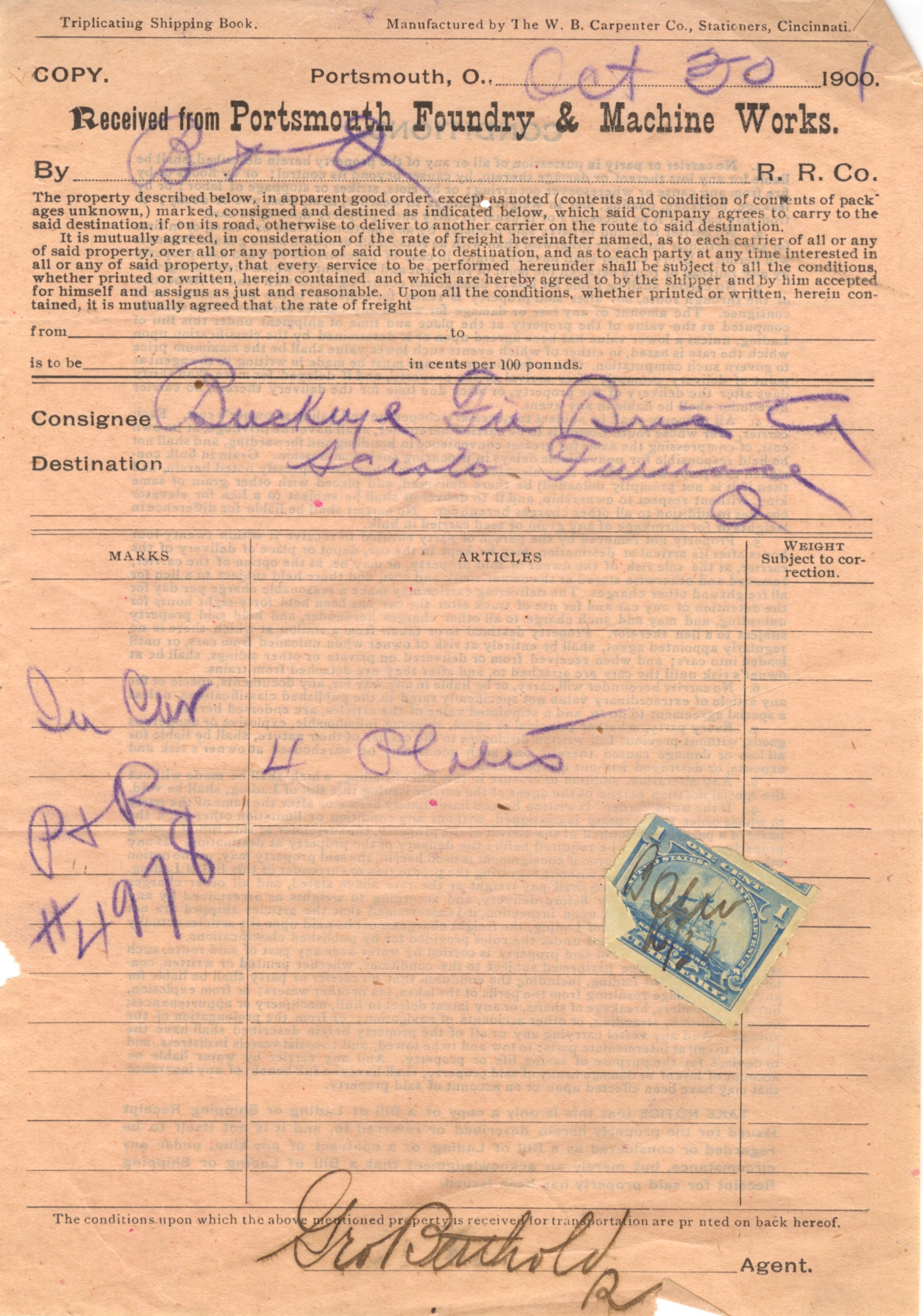 - Portsmouth Foundry & Machine Works shipping slip to Buckeye Fire Brick & Clay Co., Scioto Furnace, Ohio, shipped via B & O RR. Signed by George Berthold, agent