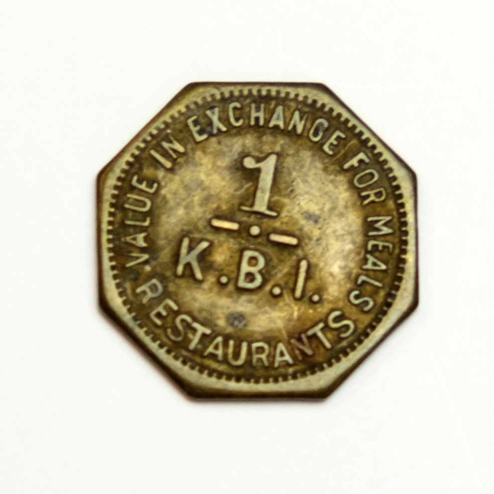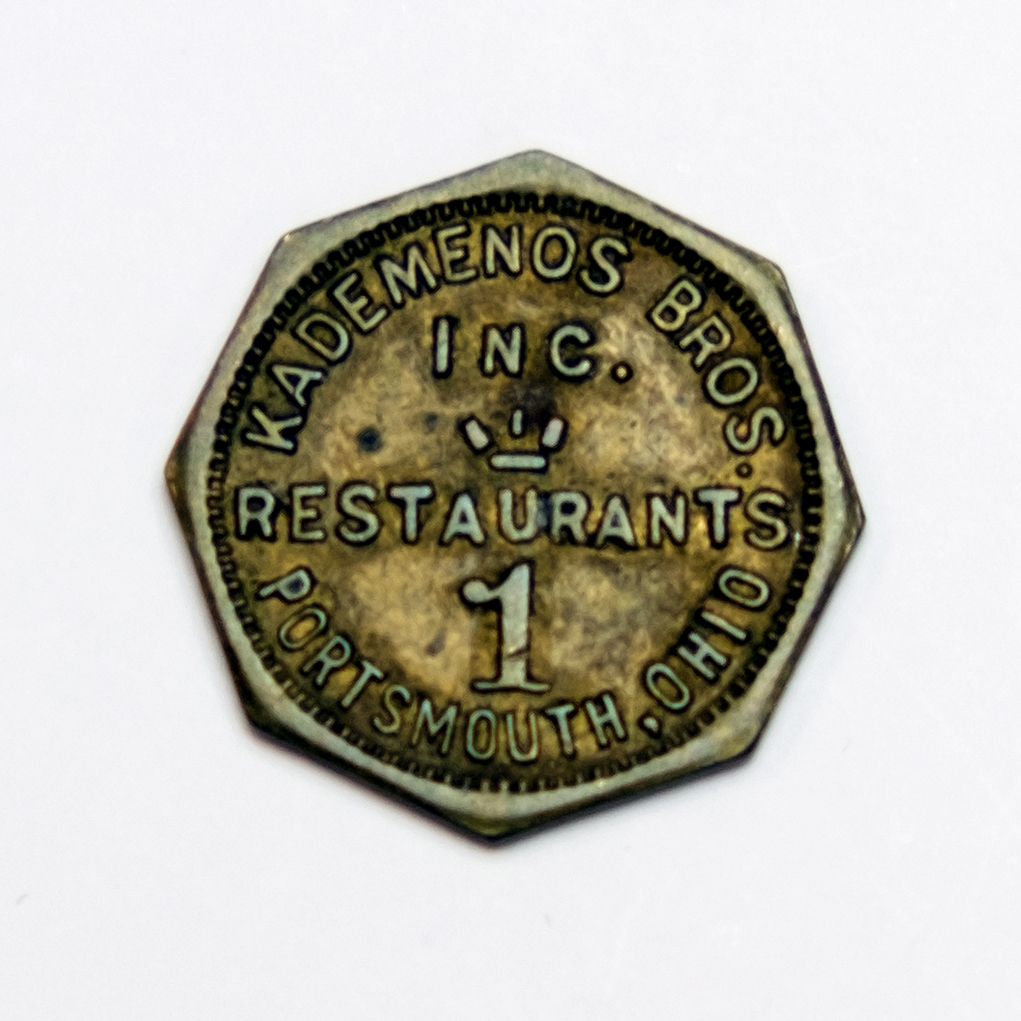 - One copper octagon shaped token:"Value in exchange for meals 1-K.B.I. Restaurants." Other side: "Kademenos Bros. Inc. Restaurants, Portsmouth, Ohio". The 1939 Portsmouth City Directory lists George P Kademenos, restaurant manager at WS Corp (Wheeling Steel)