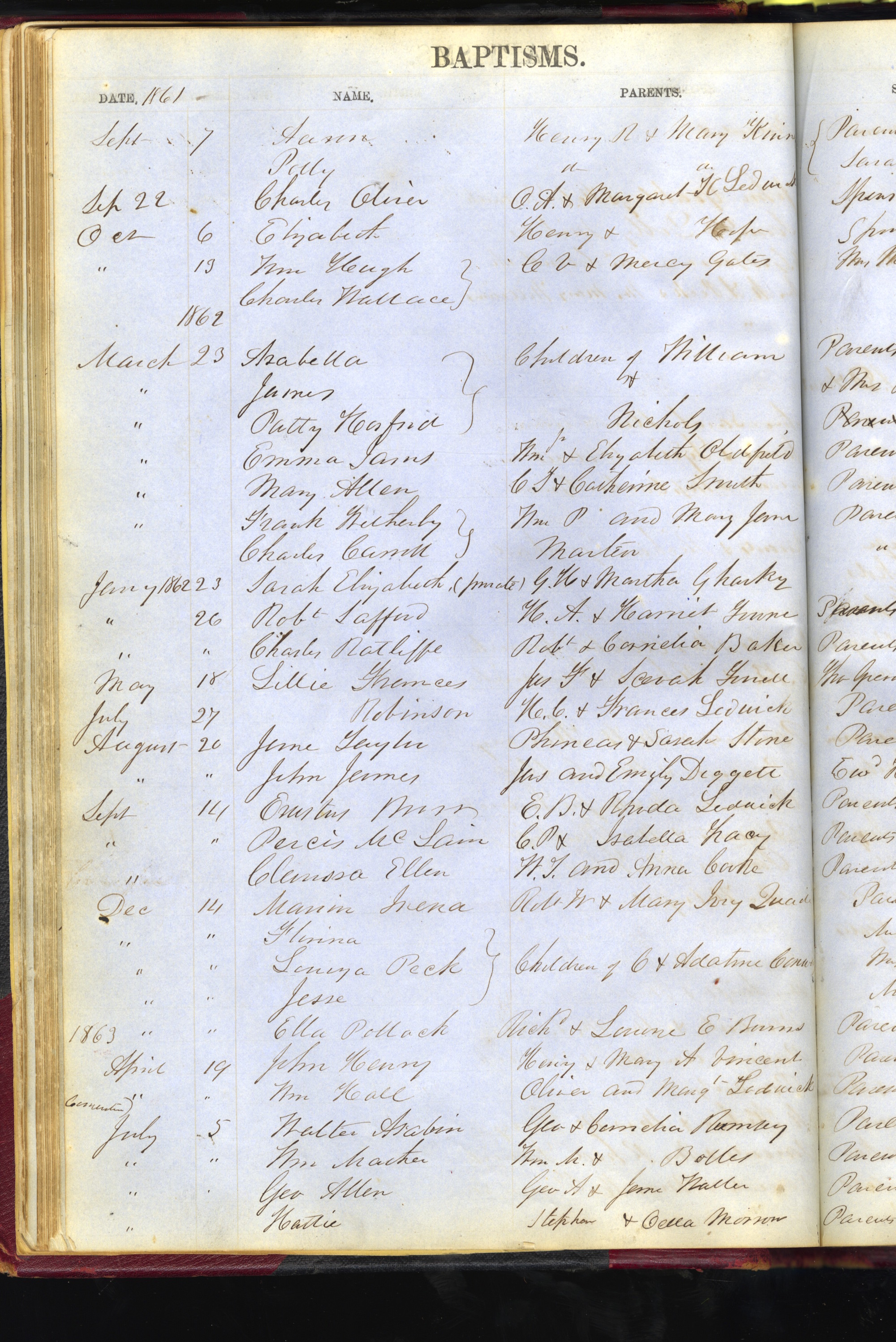 - scan of cursive written page of the Parish register for All Saints Church, Portsmouth, Ohio. Listed are the baptisms.
