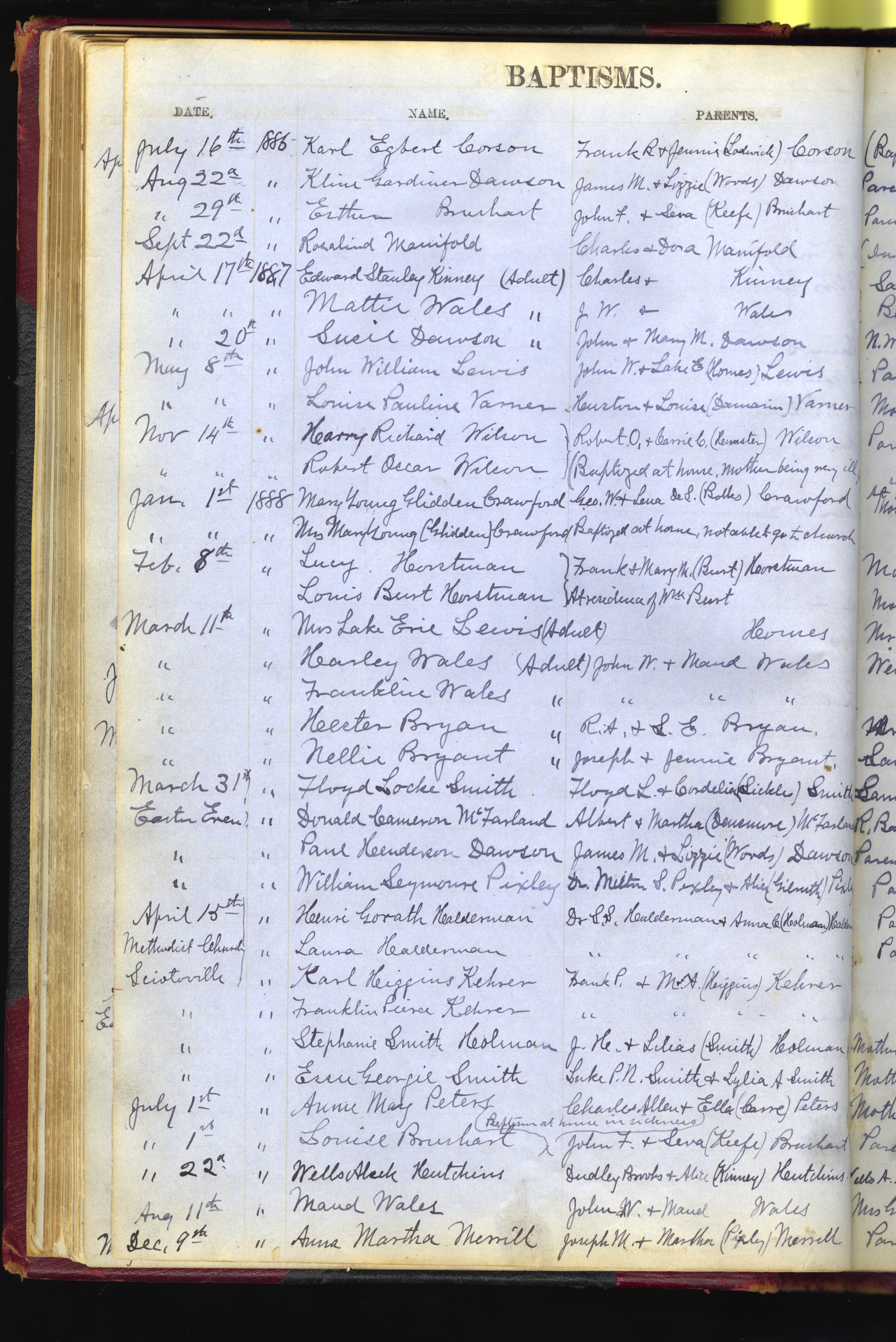 - scan of cursive written page of the Parish register for All Saints Church, Portsmouth, Ohio. Listed are the baptisms.