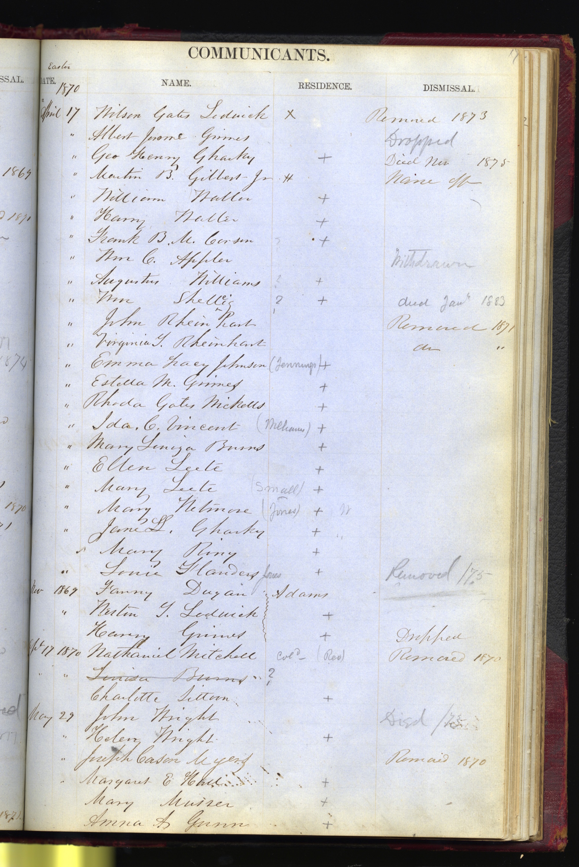 - scan of cursive written page of the Parish register for All Saints Church, Portsmouth, Ohio. Listed are communicants.