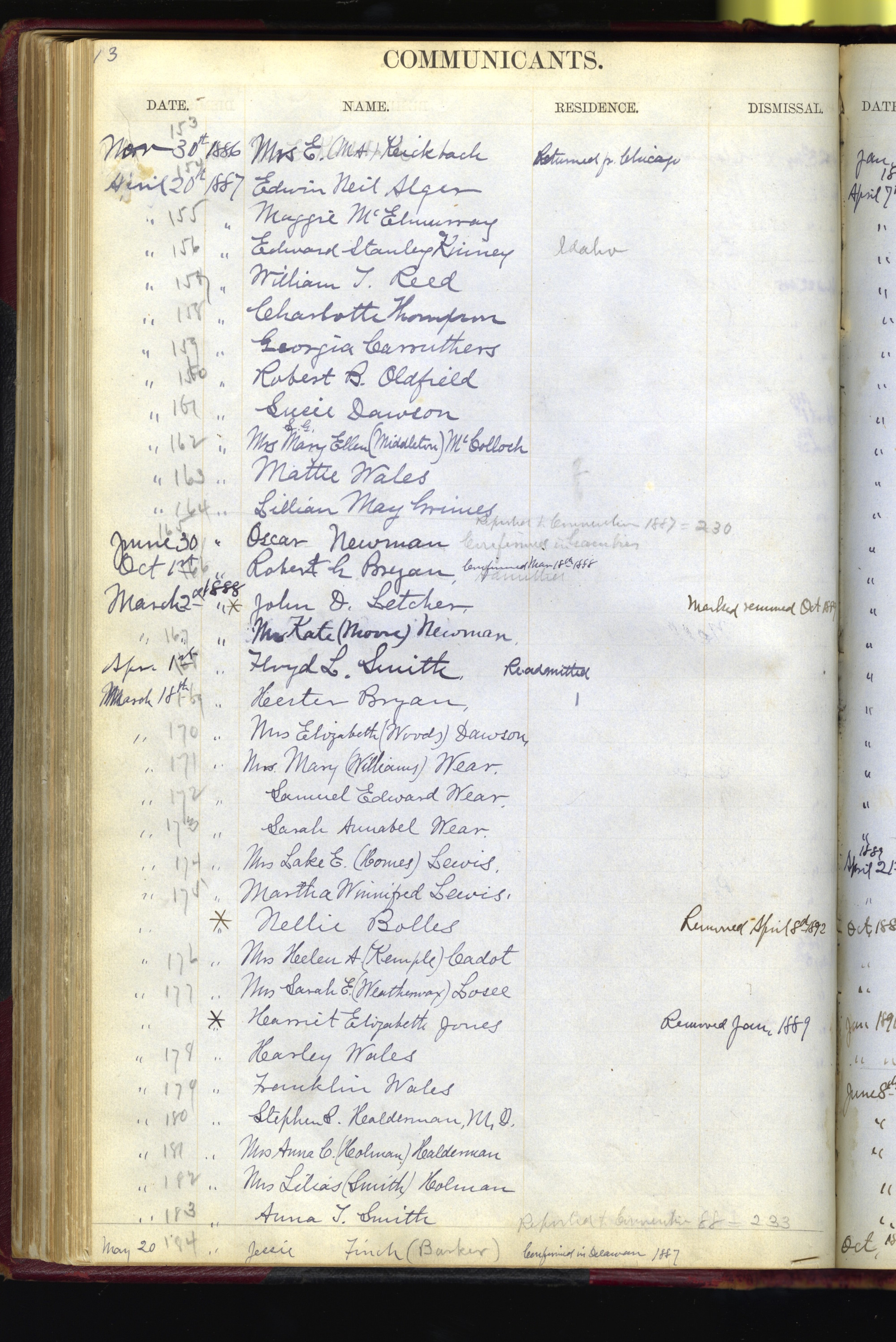 - scan of page from All Saints Church Ledger. Shown is typed title at top of page "communicants" with handwritten names, dates, residences, and dismissals listed beneath.