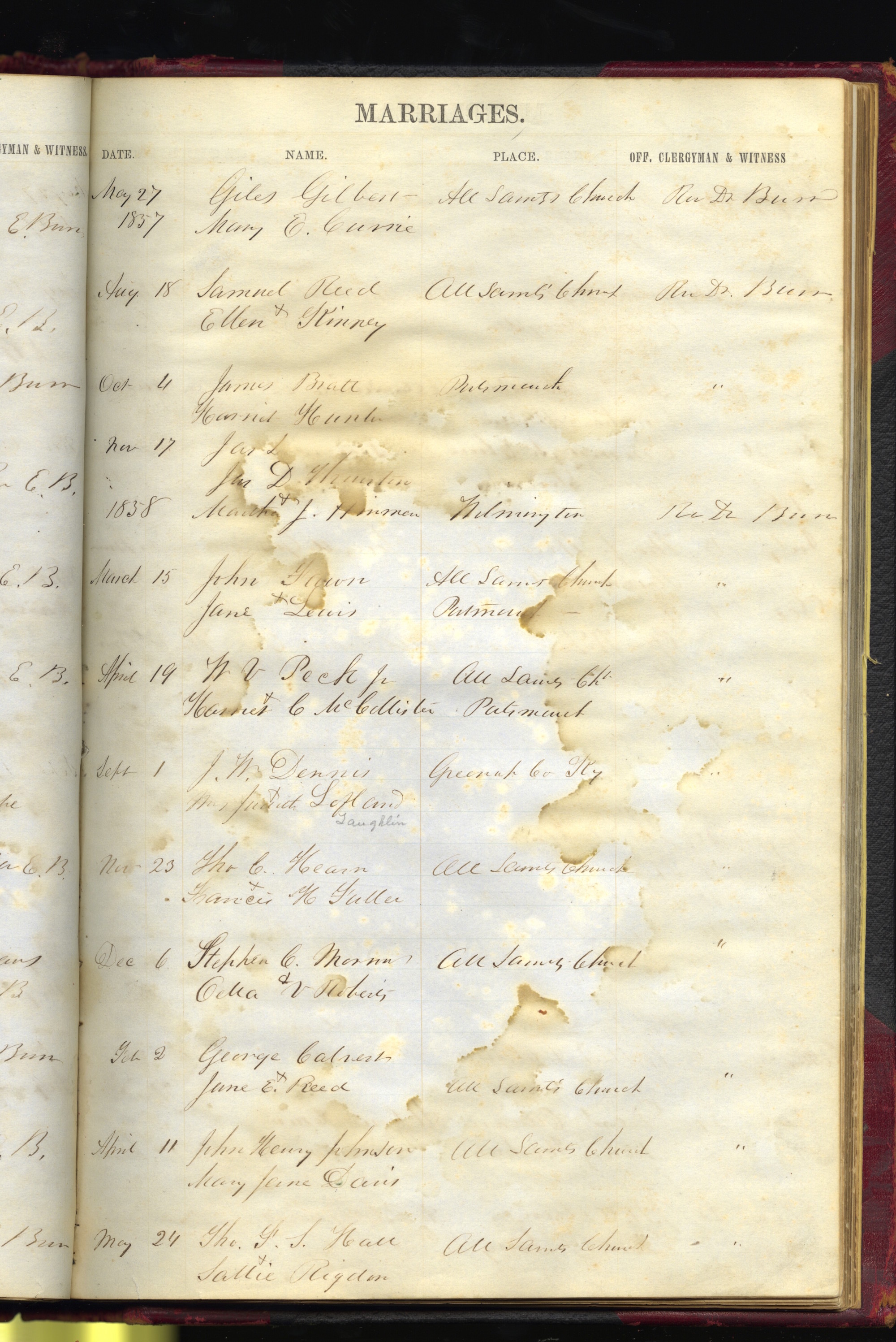 - scan of page from All Saints Church Ledger. Shown is typed page titled "marriages" with handwritten names, dates, places, and witnesses listed beneath.
