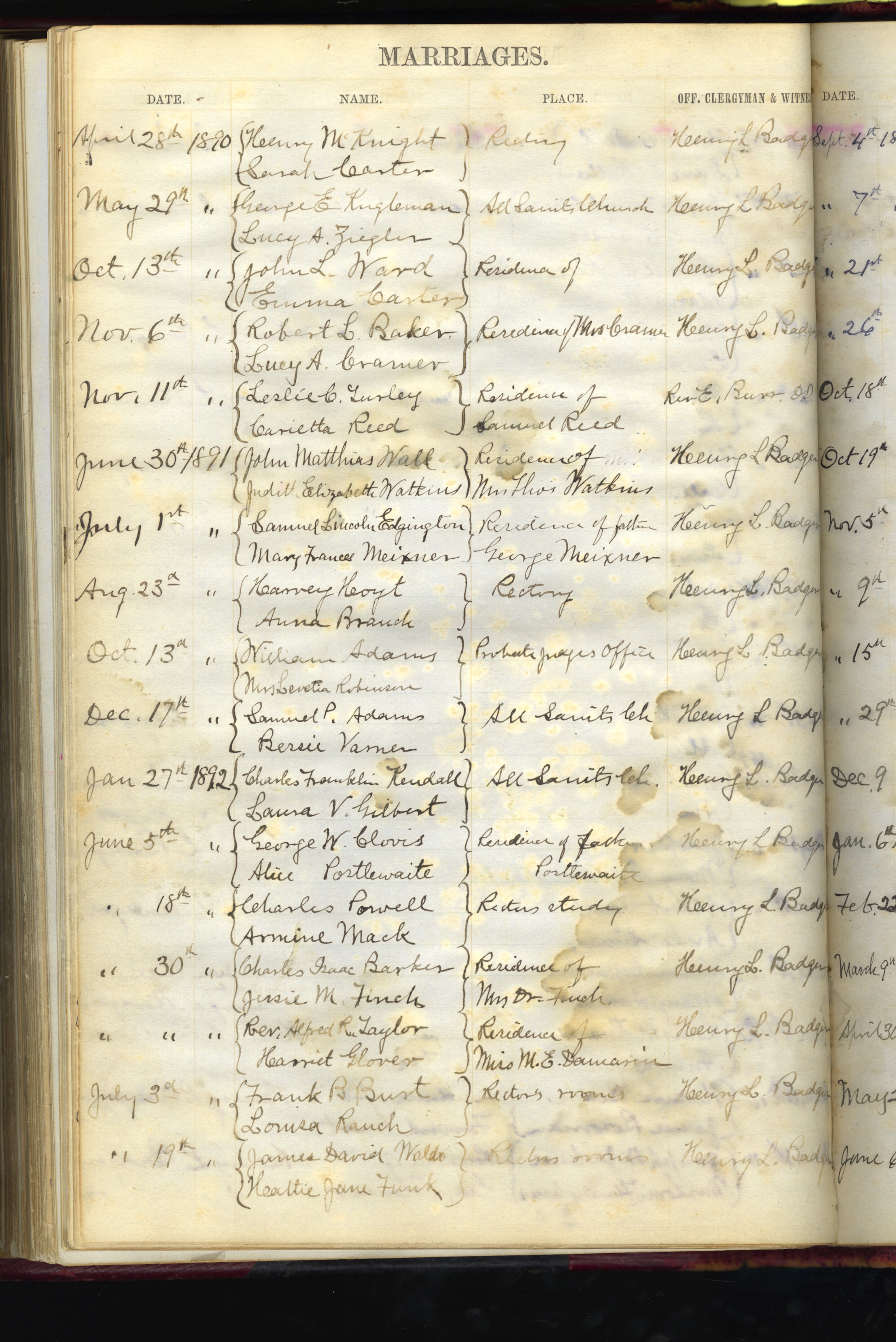 - scan of page from All Saints Church Ledger. Shown is typed page titled "marriages" with handwritten names, dates, places, and witnesses listed beneath.