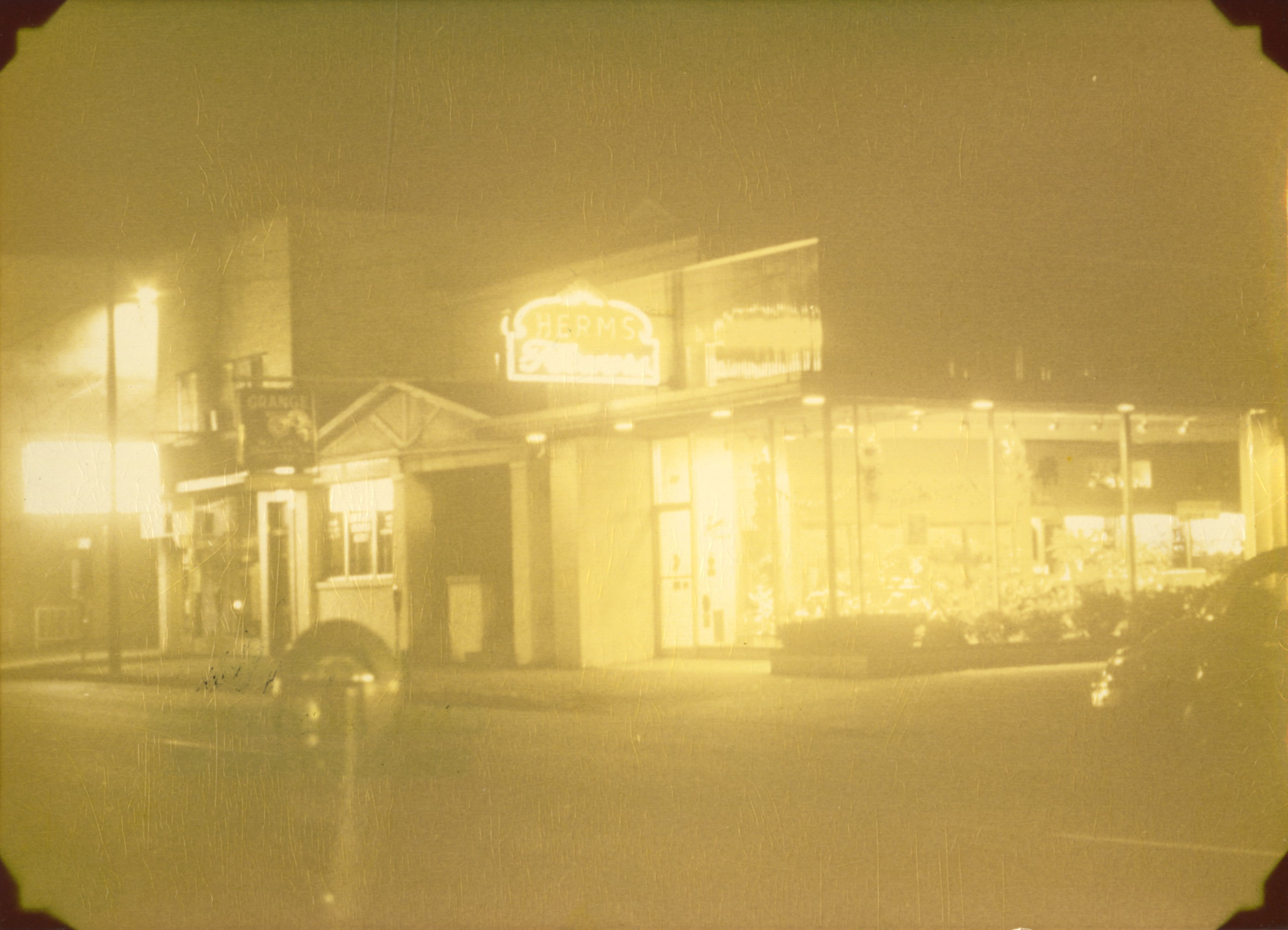 - Black & white photograph. Herms Flower Shop, 837 Sixth (6th) Street.