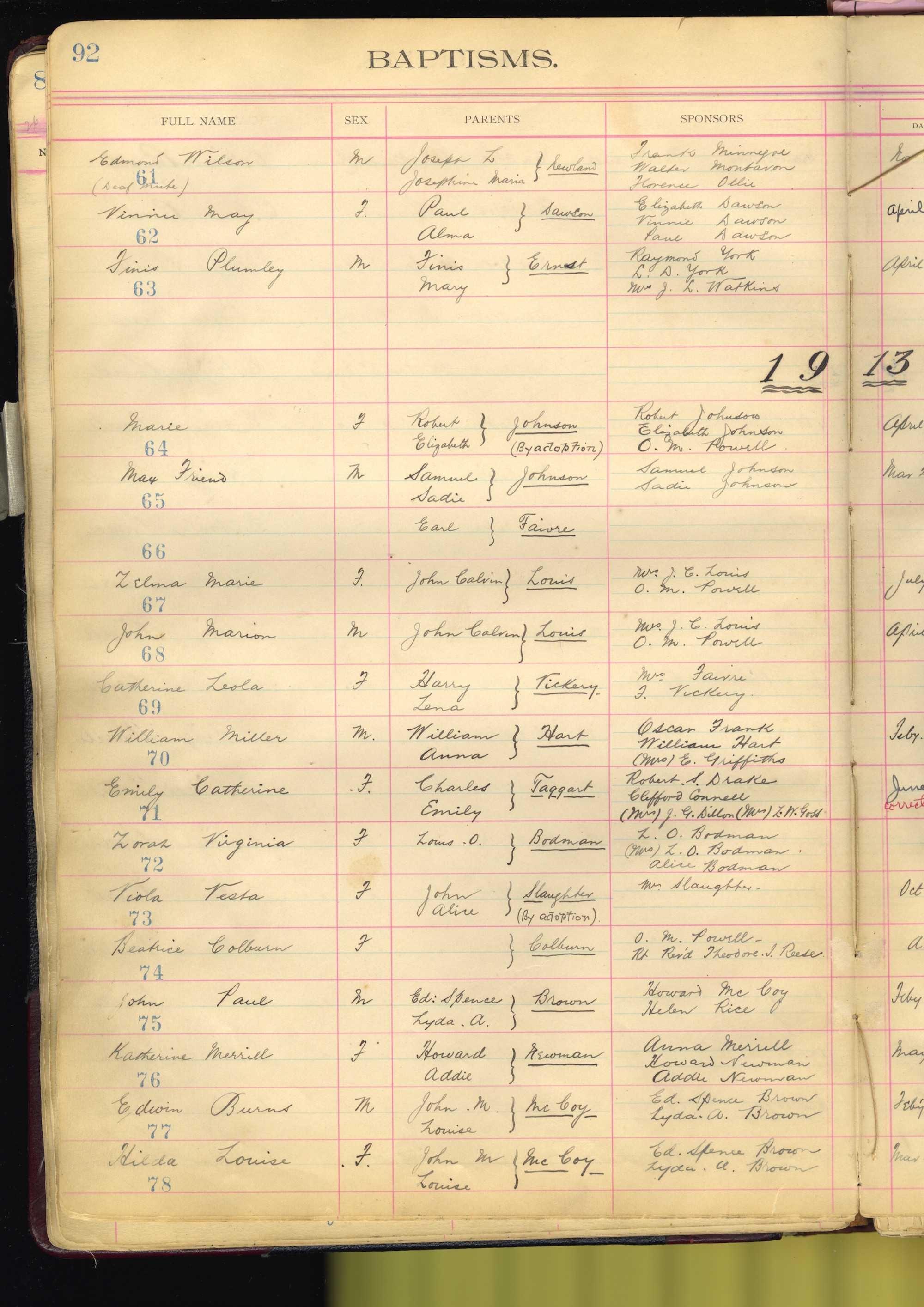 - scan of page from All Saints Church Ledger. Shown is typed title at top of page "baptisms" with handwritten information listed in rows beneath.