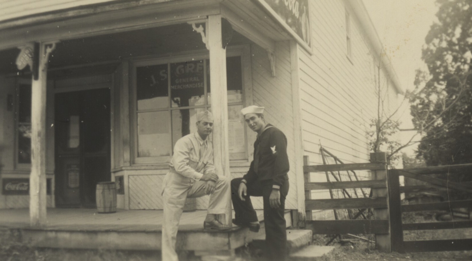 - Black & white photograph. Written on back: "Uncle Dave & Dad. Grandpa Store. 1945"
