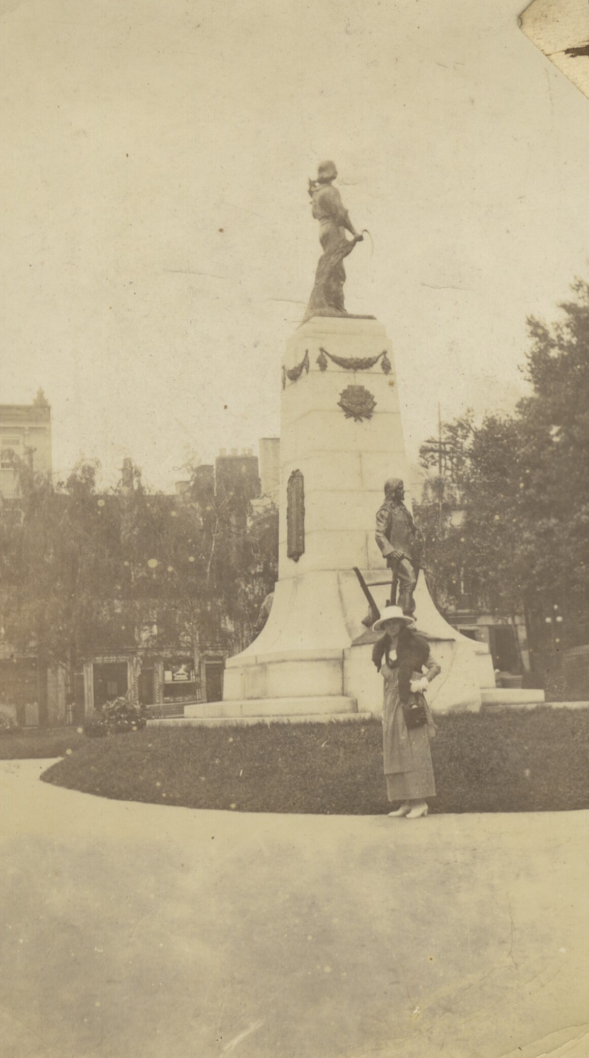 Written on back: "Me in Quebec in front of the Statue of the founder of that town." - Creator