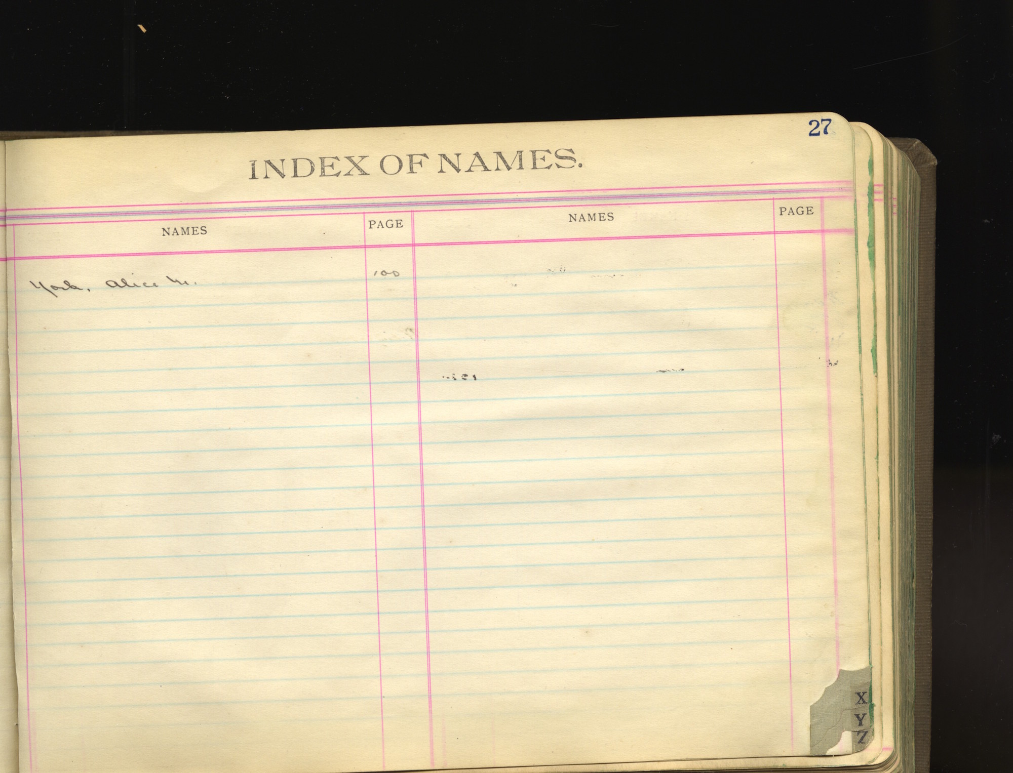 - scan of page from All Saints Church Ledger. Shown is typed title at top of page "index of names" with handwritten information listed in rows beneath.