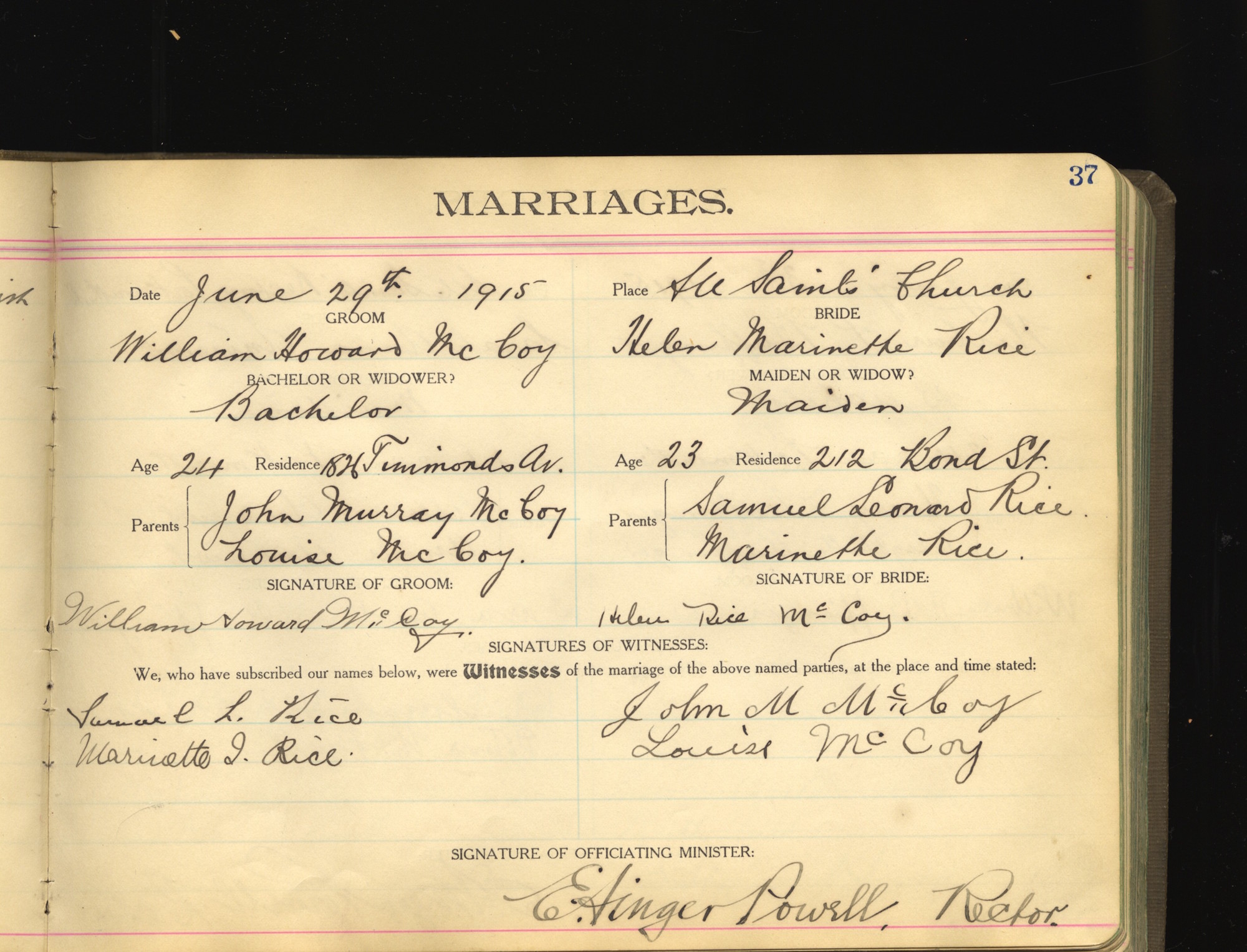 - scan of page from All Saints Church Ledger. Shown is typed title at top of page "marriages" with handwritten information listed beneath.