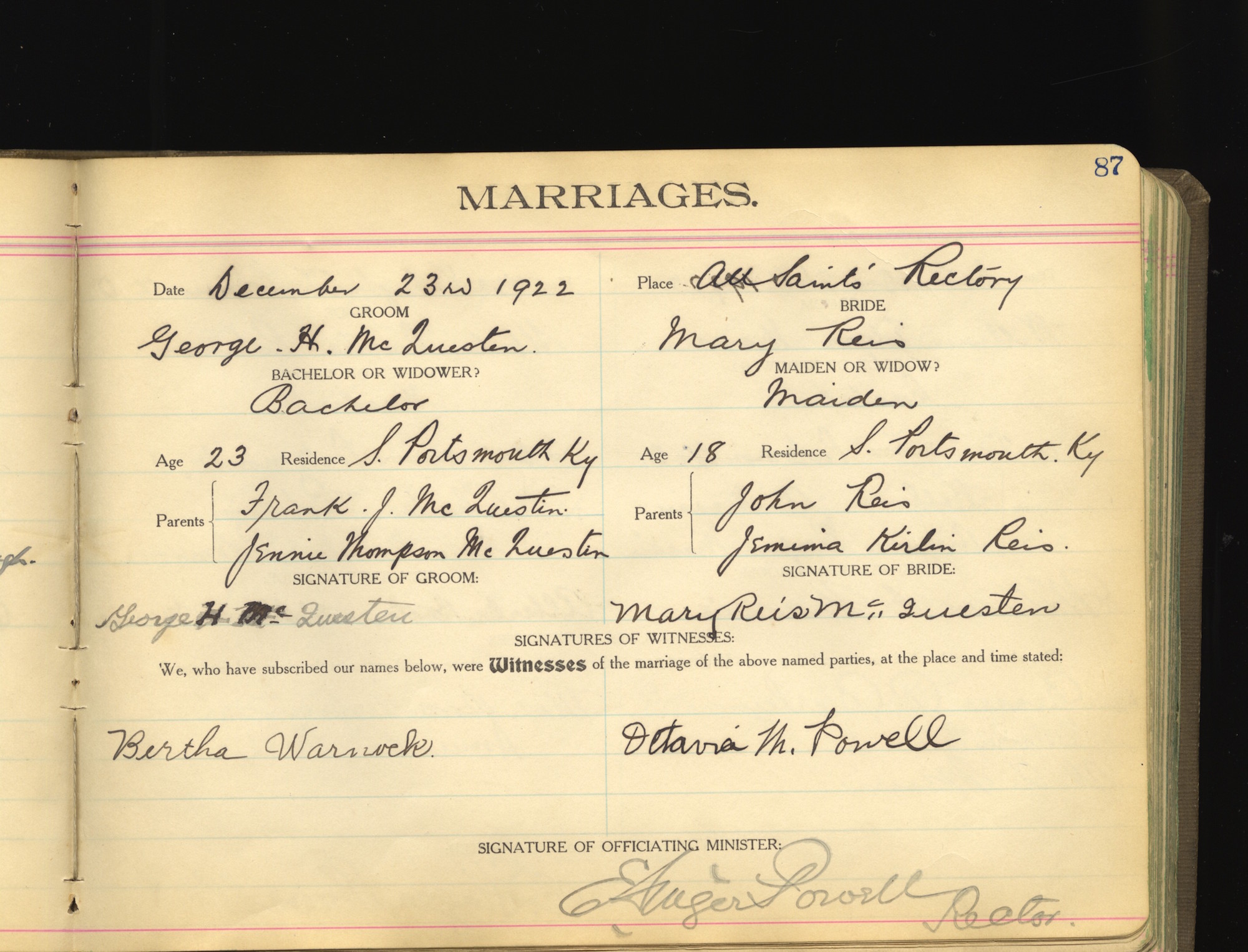 - scan of page from All Saints Church Ledger. Shown is typed title at top of page "marriages" with handwritten information listed beneath.