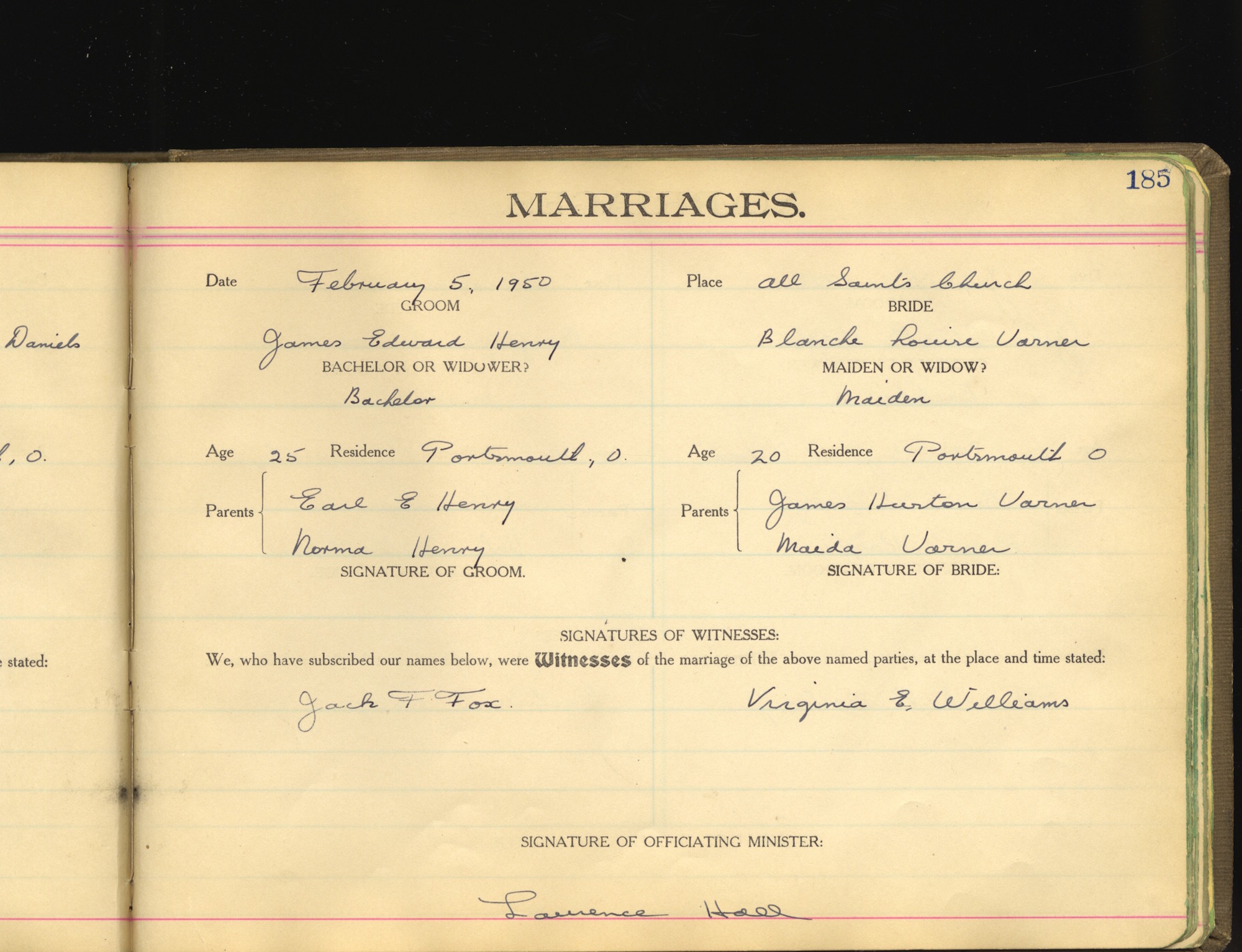 - scan of page from All Saints Church Ledger. Shown is typed title at top of page "marriages" with handwritten information listed beneath.