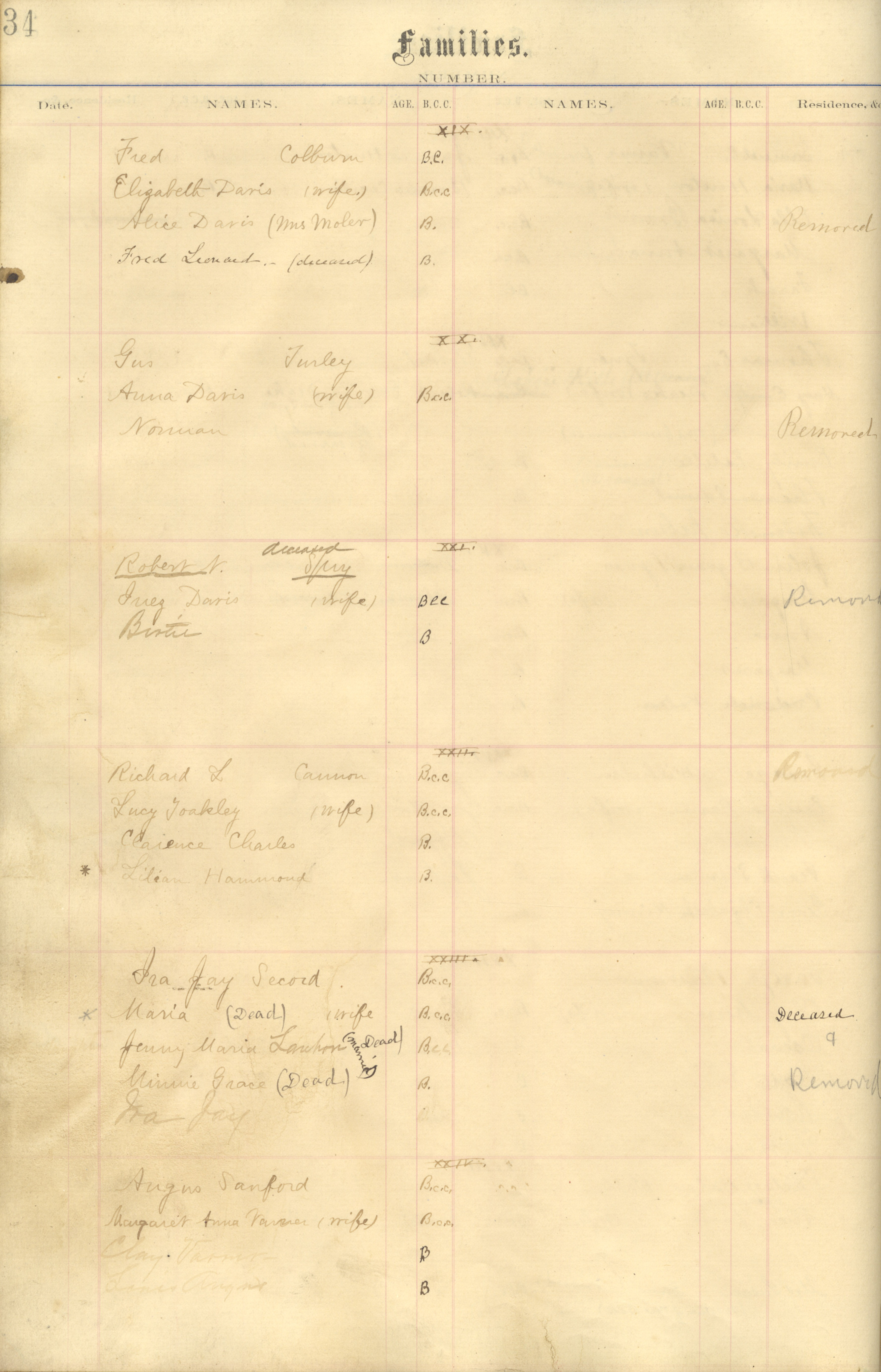 - scan of page from All Saints Church Ledger. Shown is typed title at top of page "families" with handwritten names, dates, and residences listed beneath.