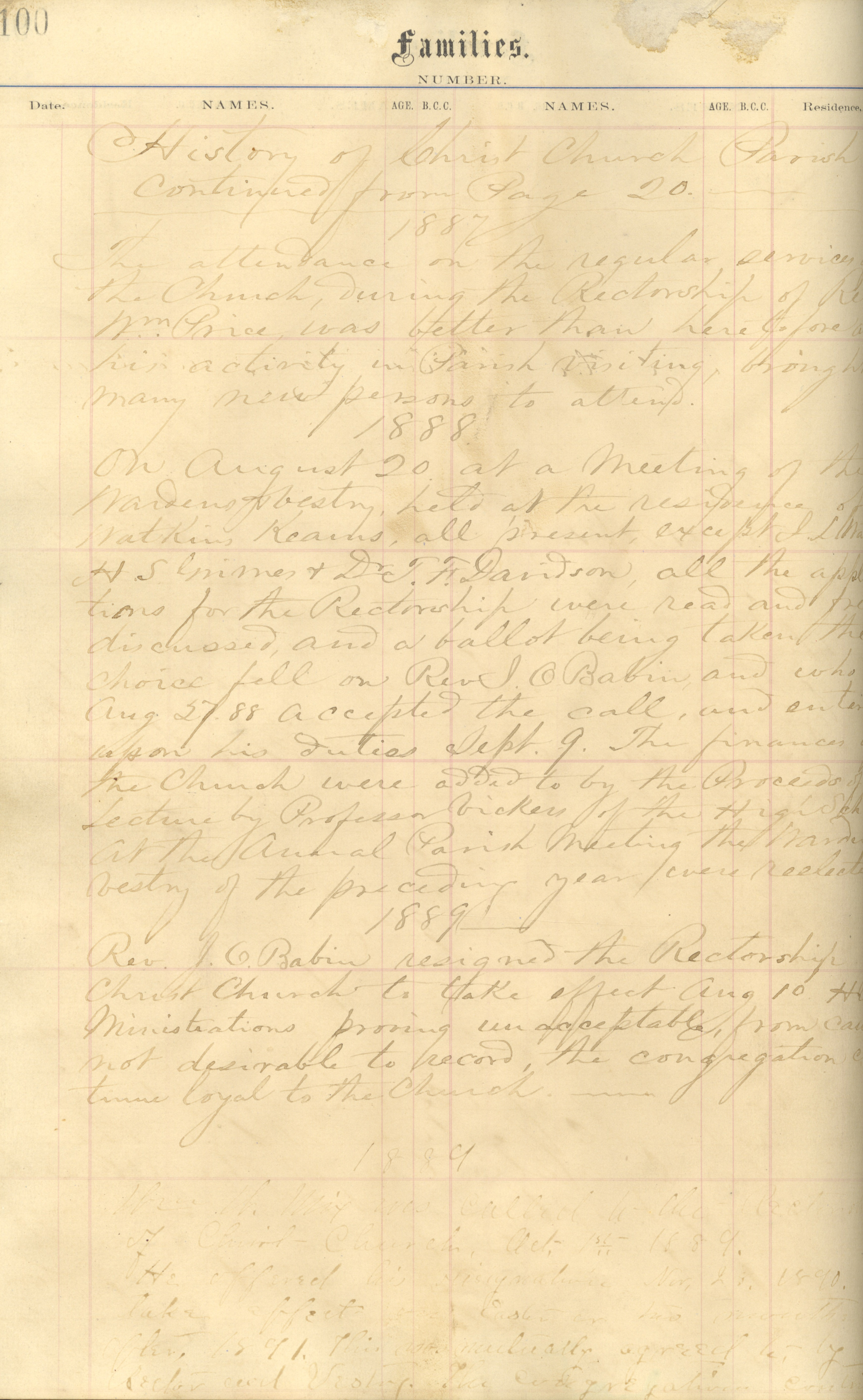 - scan of page from All Saints Church Ledger. Shown is typed title at top of page "families" with handwritten names, dates, and residences listed beneath.