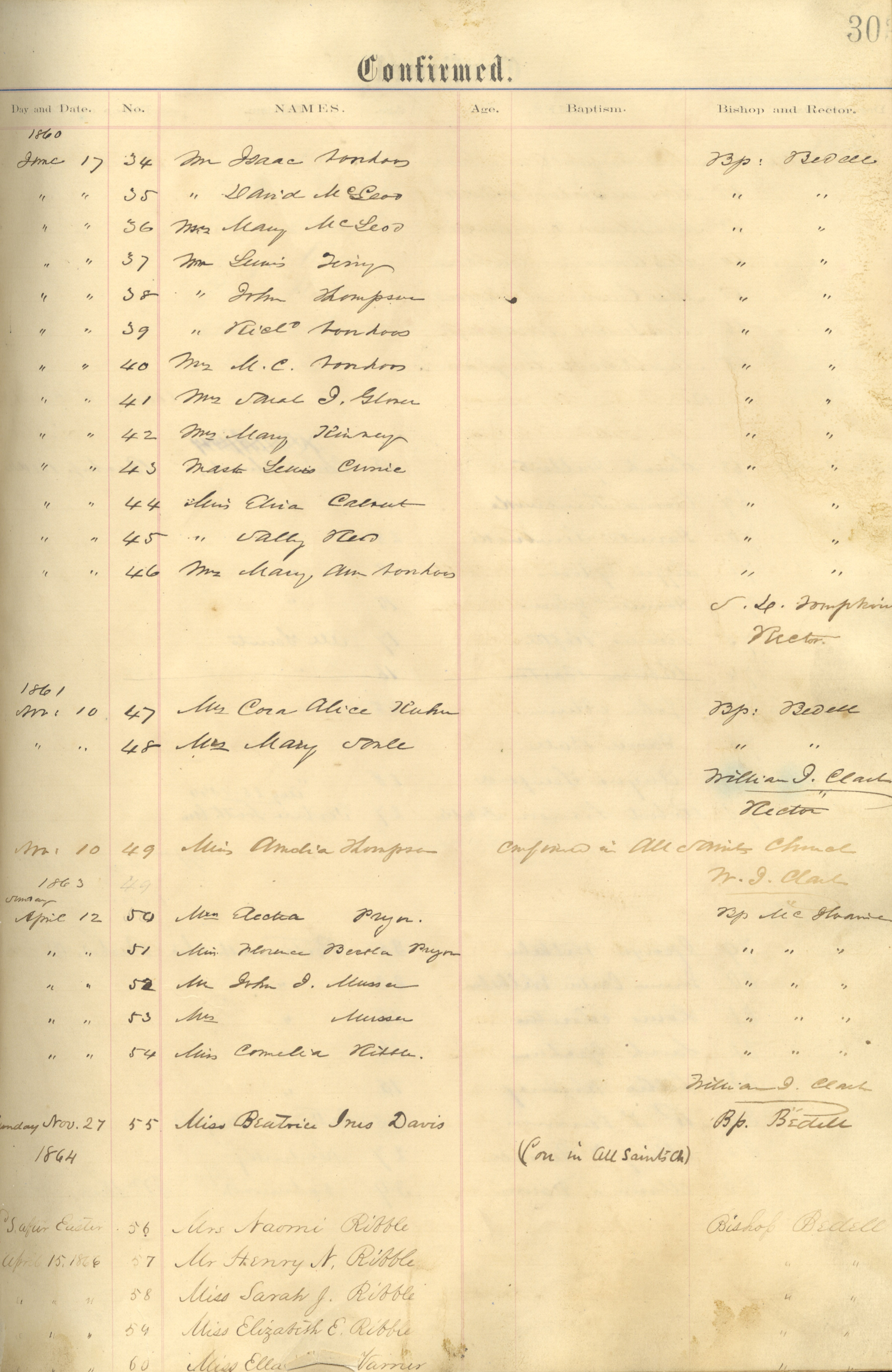 - scan of page from All Saints Church Ledger. Shown is typed title at top of page "confirmed" with handwritten names, dates, baptisms, bishop, and rector listed beneath.