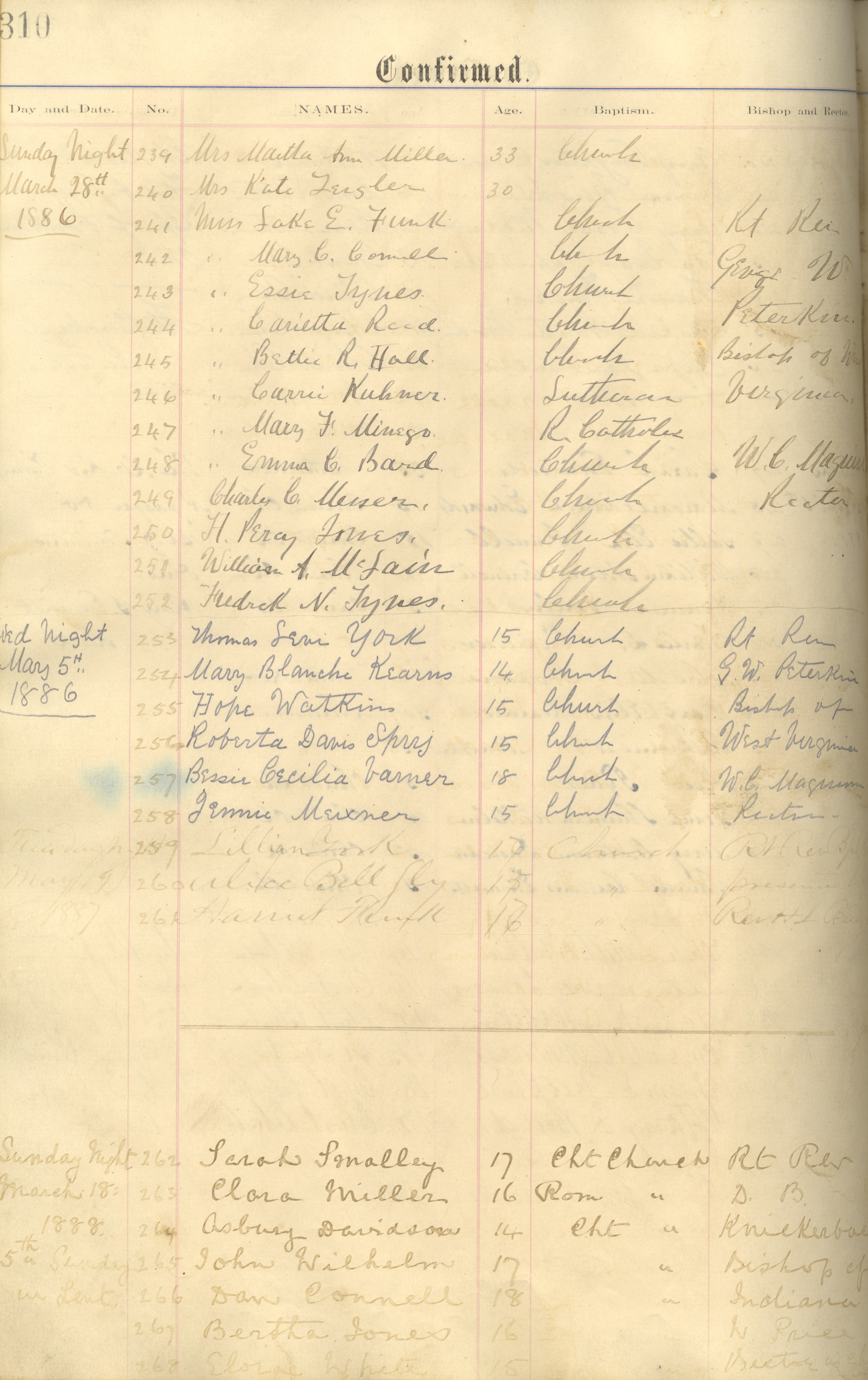 - scan of page from All Saints Church Ledger. Shown is typed title at top of page "confirmed" with handwritten names, dates, baptisms, bishop, and rector listed beneath.