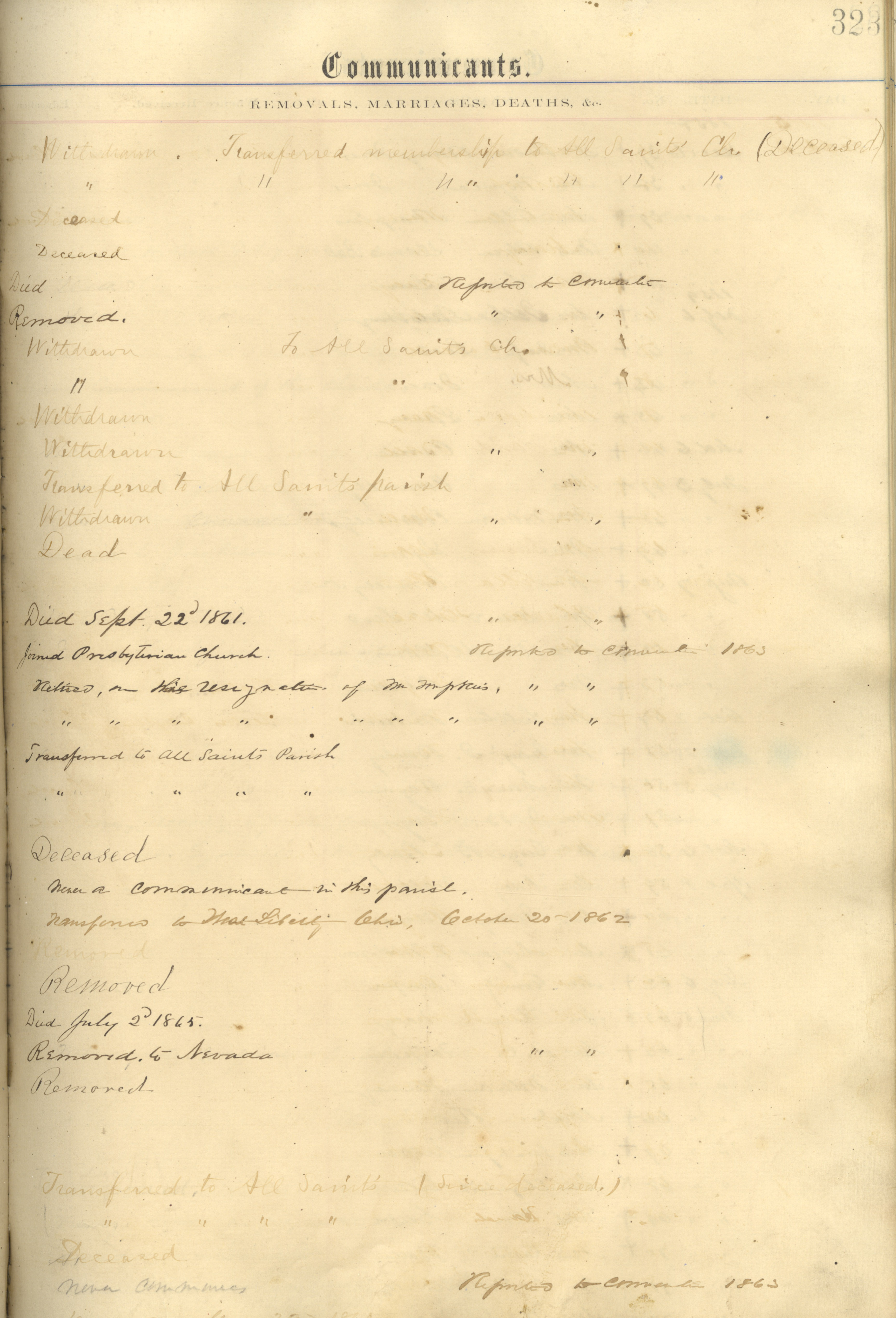 - scan of page from All Saints Church Ledger. Shown is typed title at top of page "communicants" with handwritten names and dates listed beneath.