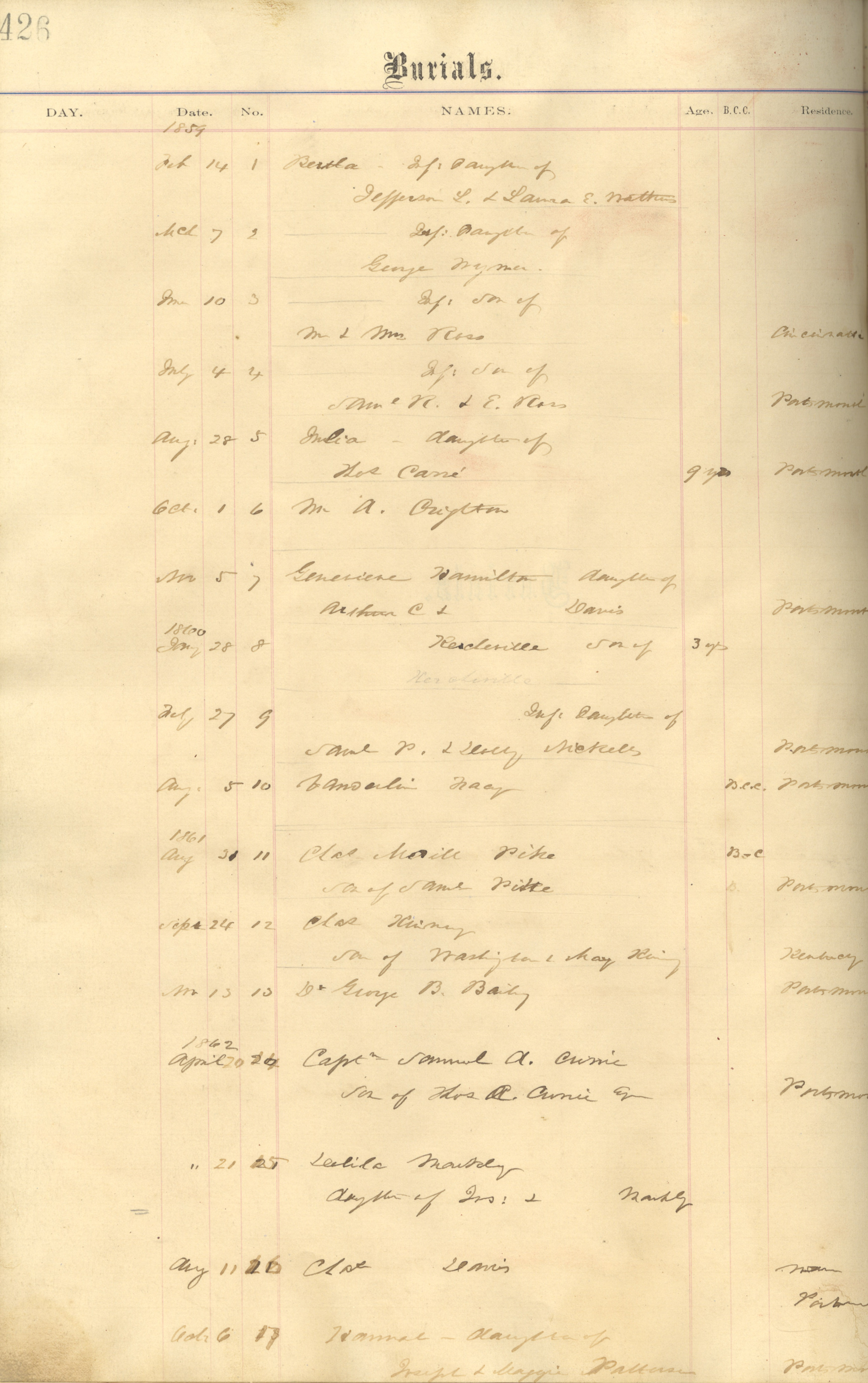 - scan of page from All Saints Church Ledger. Shown is typed title at top of page "burials" with handwritten names, dates, with cause and place of death listed beneath.
