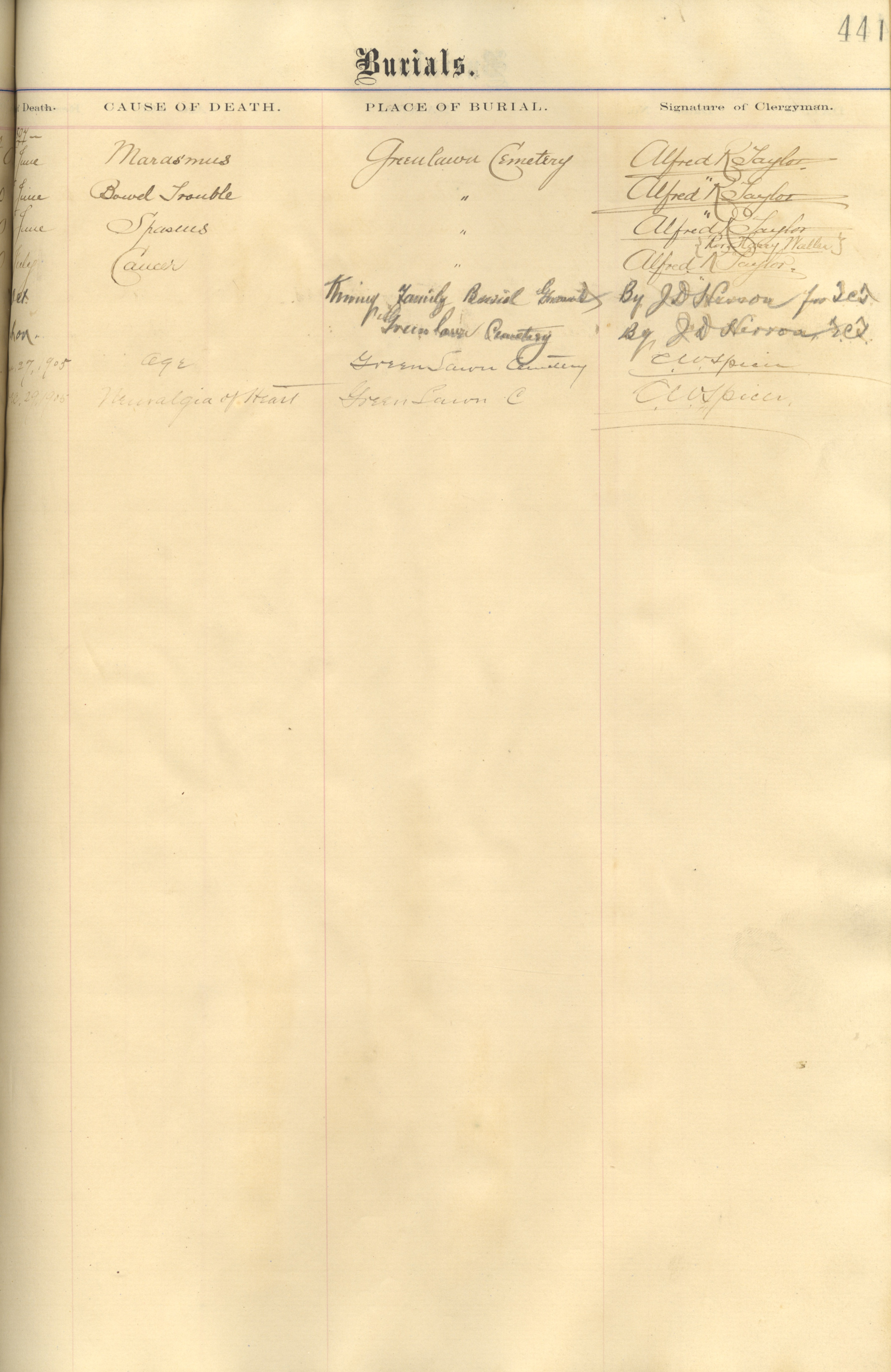 - scan of page from All Saints Church Ledger. Shown is typed title at top of page "burials" with handwritten names, dates, with cause and place of death listed beneath.