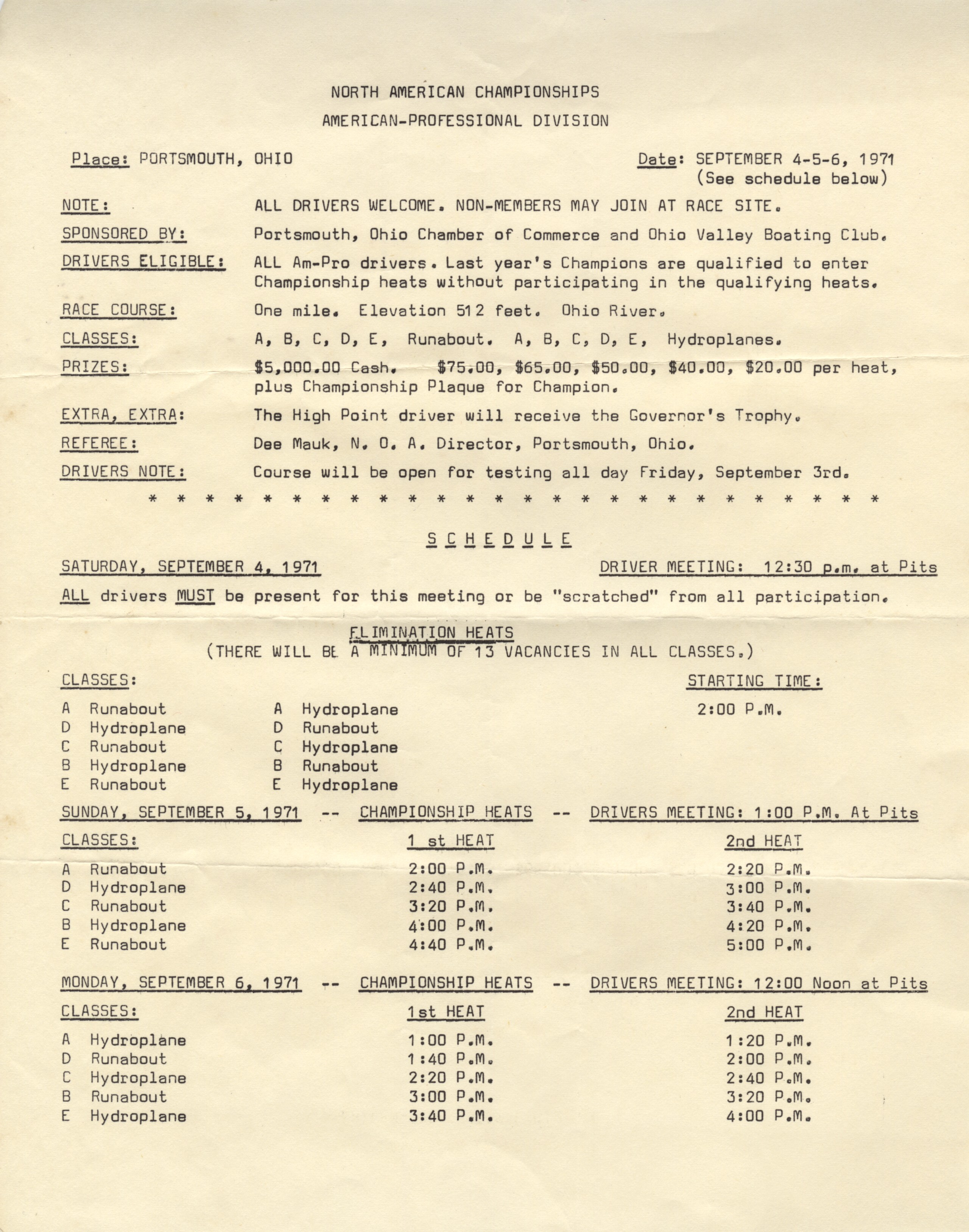 - Typed information for the boat races at 1971 River Days Festival. When the first River Days Festival was held in Portsmouth in 1963, the boat race was one of its most popular events. An estimated twenty thousand people watched the race from both sides of the Ohio River. World Championship amateur boat races were sponsored by the Ohio Valley Boating Club.