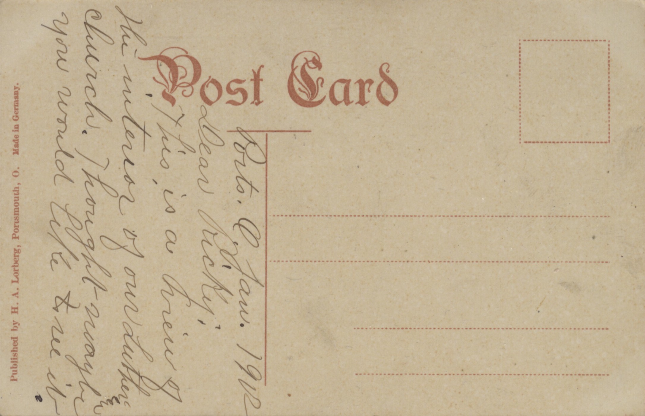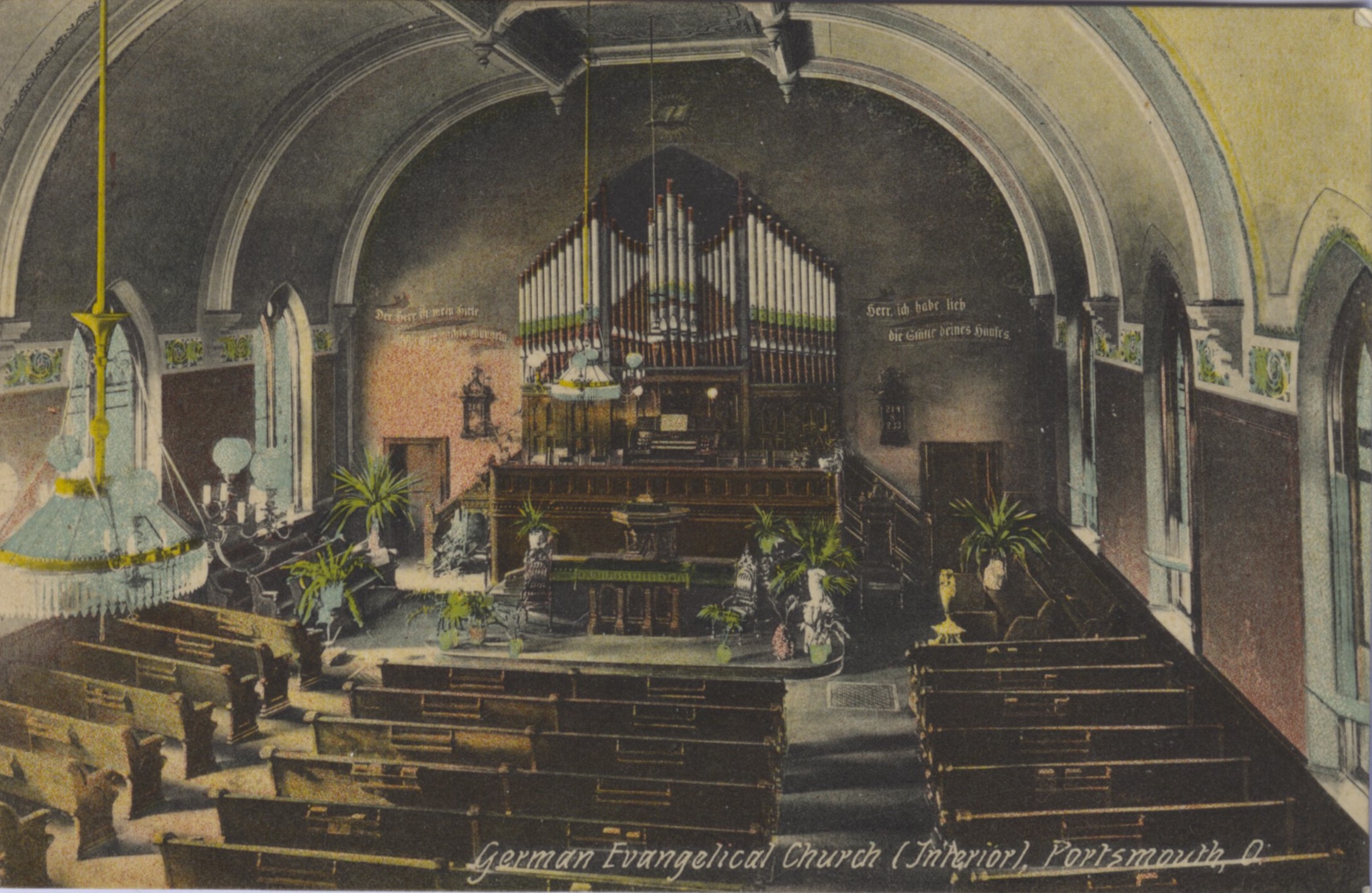 - Colorized photo image of the interior of the church building at 701 Fifth (5th) Street. The church was dedicated in 1887 and services were in German until 1918. It has been known as the Evangelical United Church of Christ since 1956.