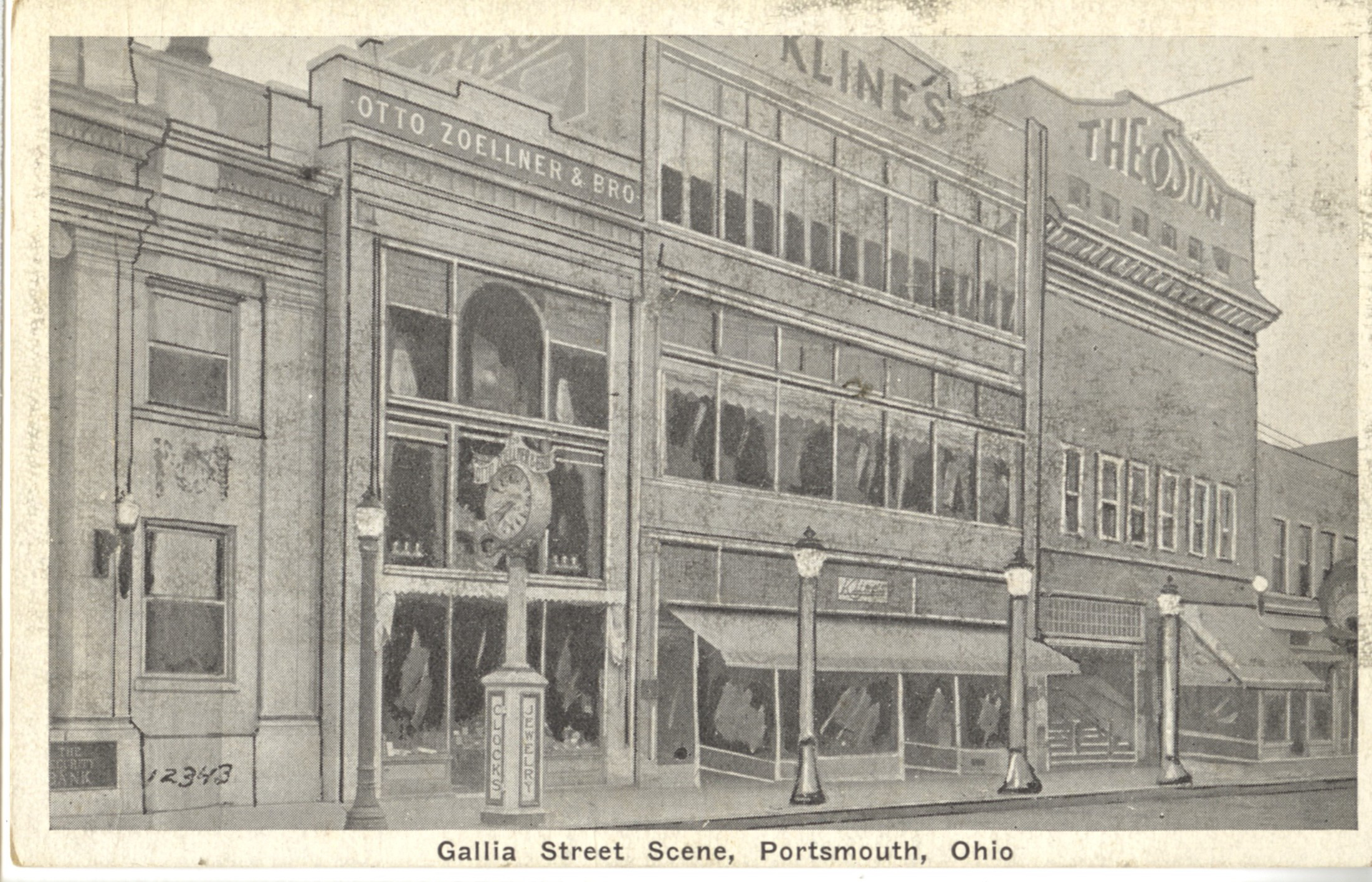 - Black & white drawing of Gallia Street north side, looking east. Shown from left are: The Security Savings Bank at 825-827, Otto Zoellner & Brothers Jewelry at 829, Kline's (ladies wear) at 831-833, and The Sun Theater at 835 Gallia Street. Listings from the 1922 Portsmouth City Directory.