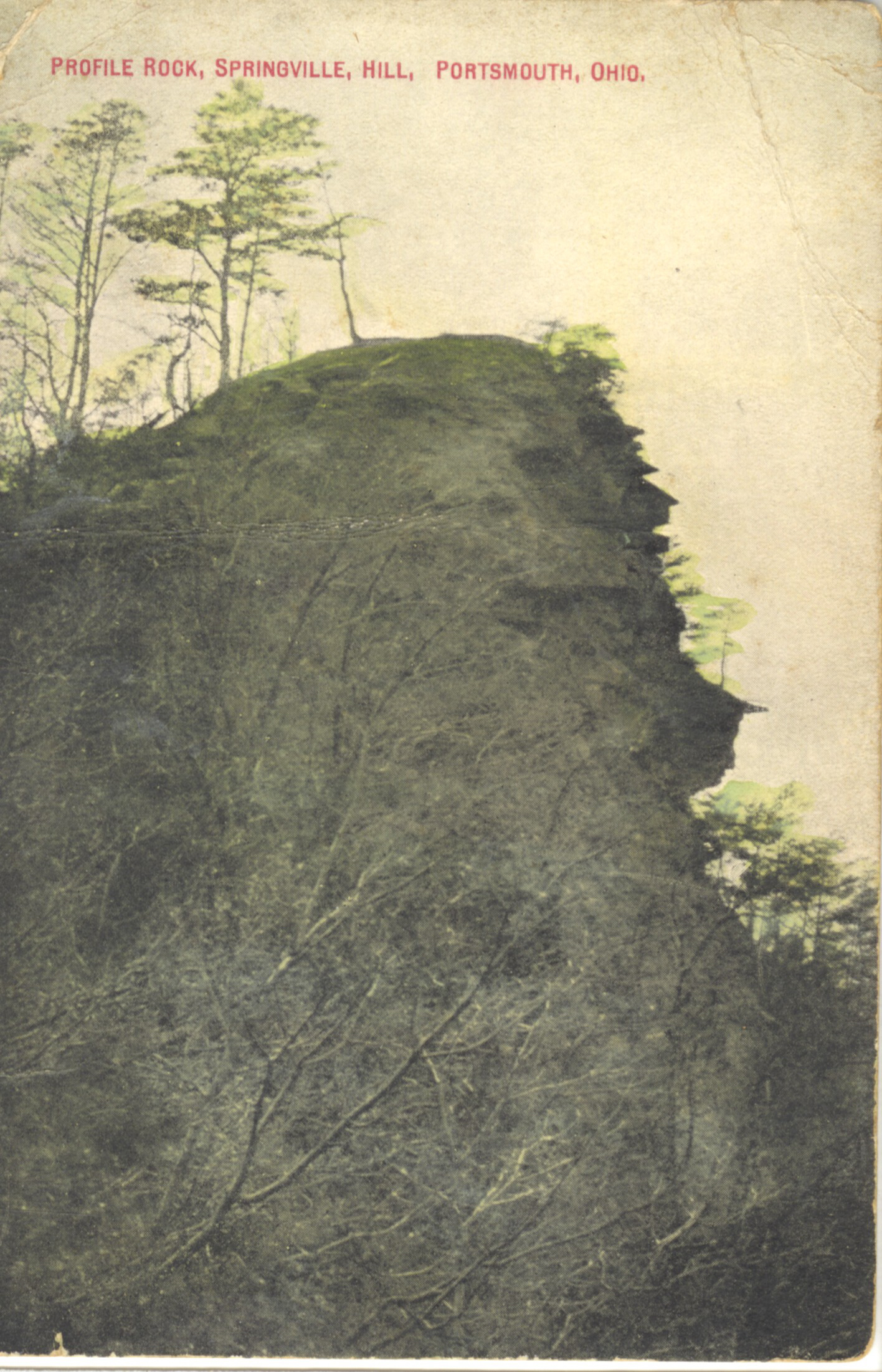 H. A. Lorberg, publisher, Portsmouth, Ohio , “Profile Rock, Springville Hill, Portsmouth, Ohio,” Scioto County Public Library Local History Digital Collection, accessed December 16, 2025, https://sciotolibrary.org/history/items/show/17948.