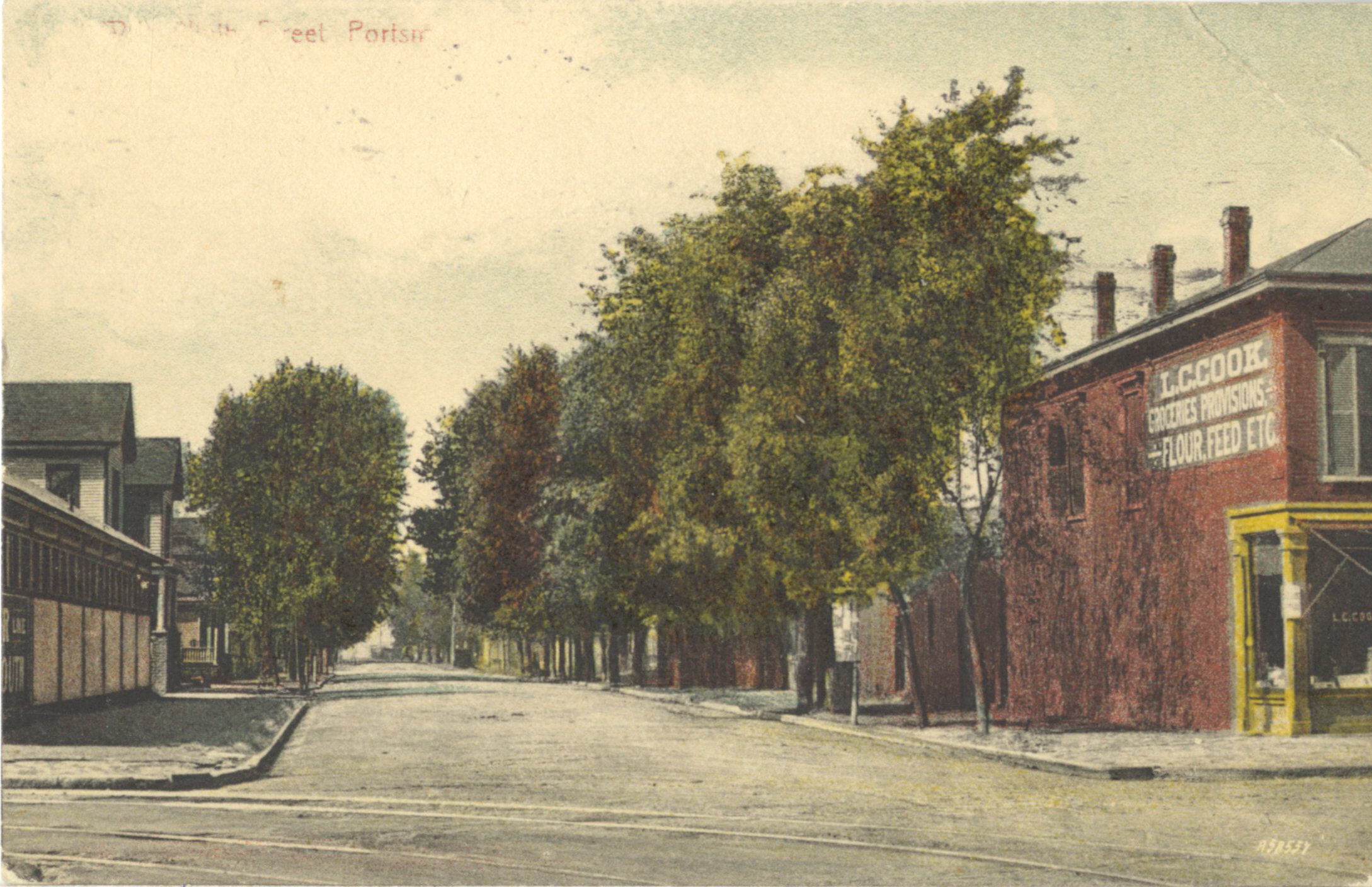 - Colorized photo image of a red brick grocery showing street scene with trees. The grocery store was located at 1022 Clay Street and was owned and operated by Leonard Cook.