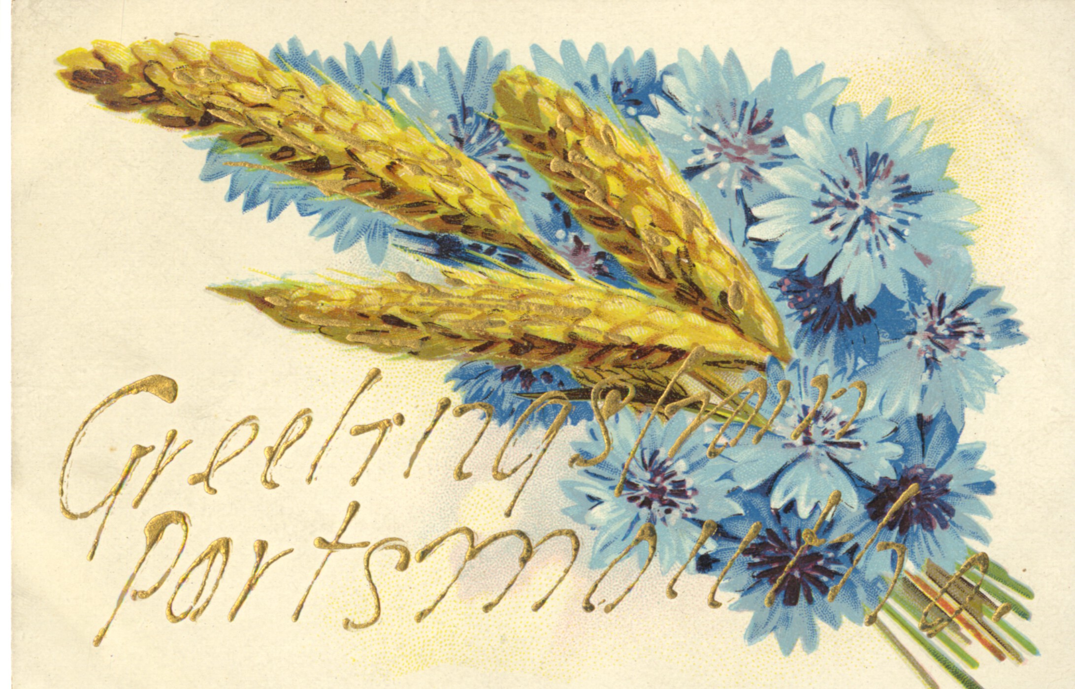 - "Greetings From Portsmouth, O." written in golden script with blue flowers and two wheat pieces in the background.