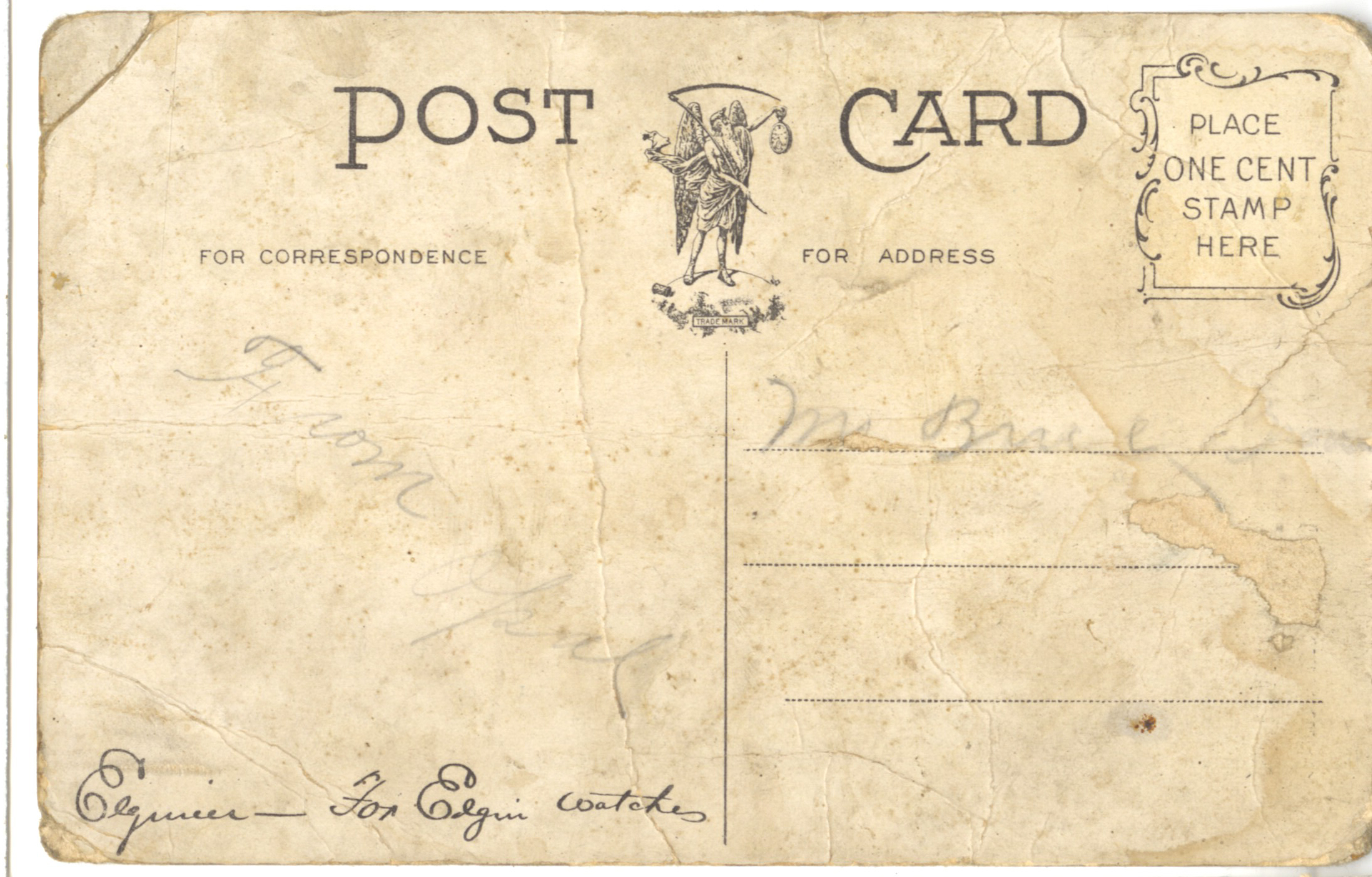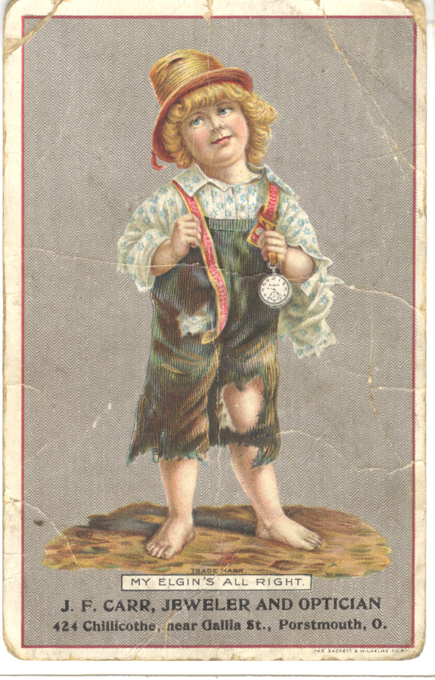 - Colorized illustration of young child with bib overalls and holding an Elgin pocket watch
