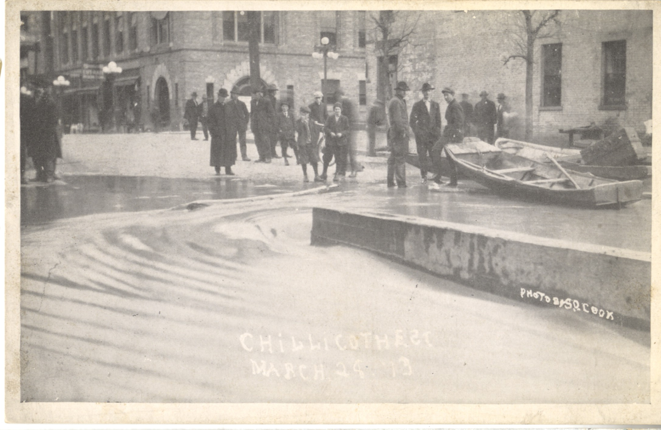 - Black and white photo image of Chillicothe Street during the 1913 flood