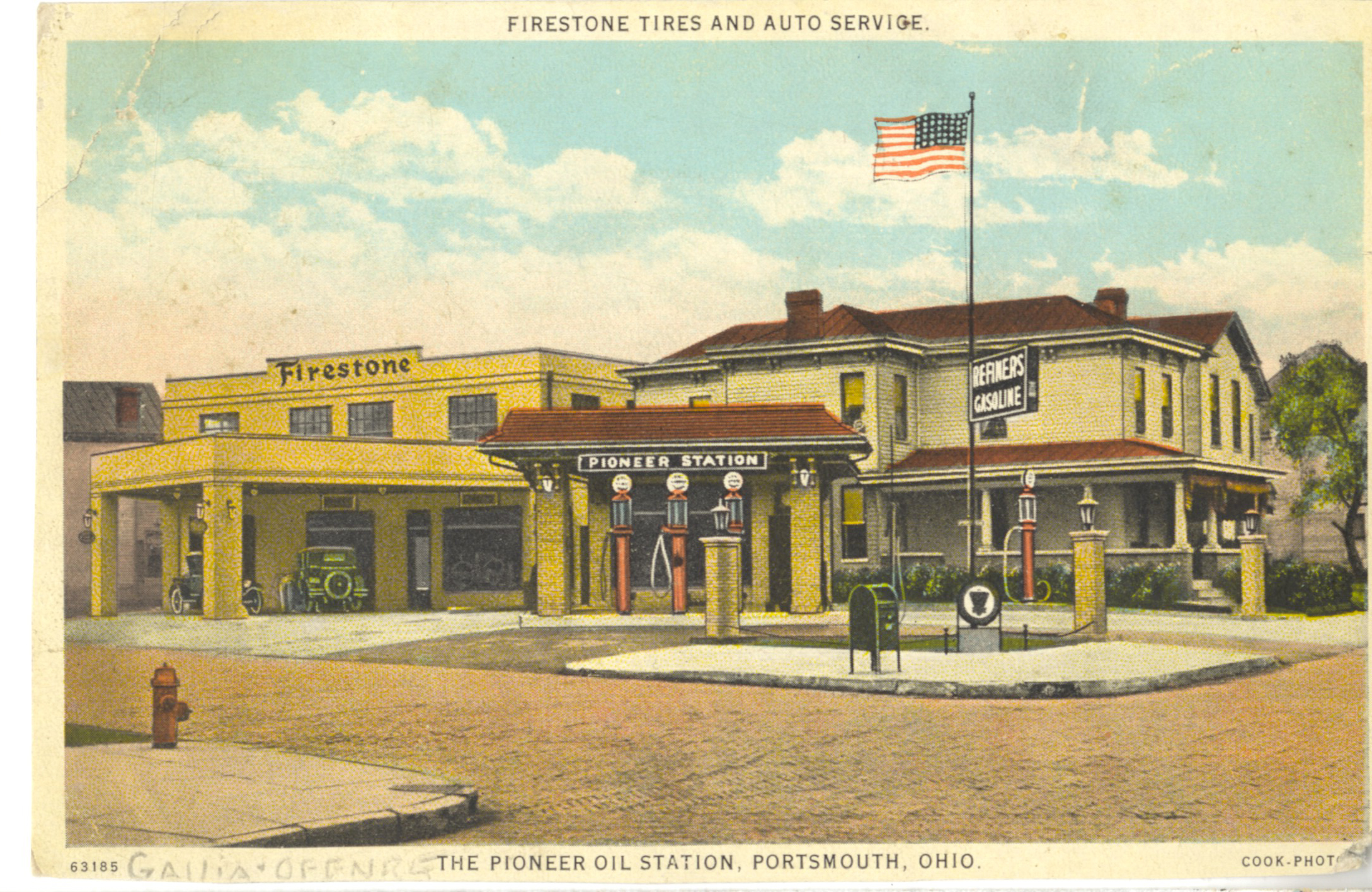 - Colorized photo image of Firestone Tires and Auto Service and the Pioneer Oil Station, the first gas station in Portsmouth, Ohio, located at the corner of Gallia and Offnere Sts.