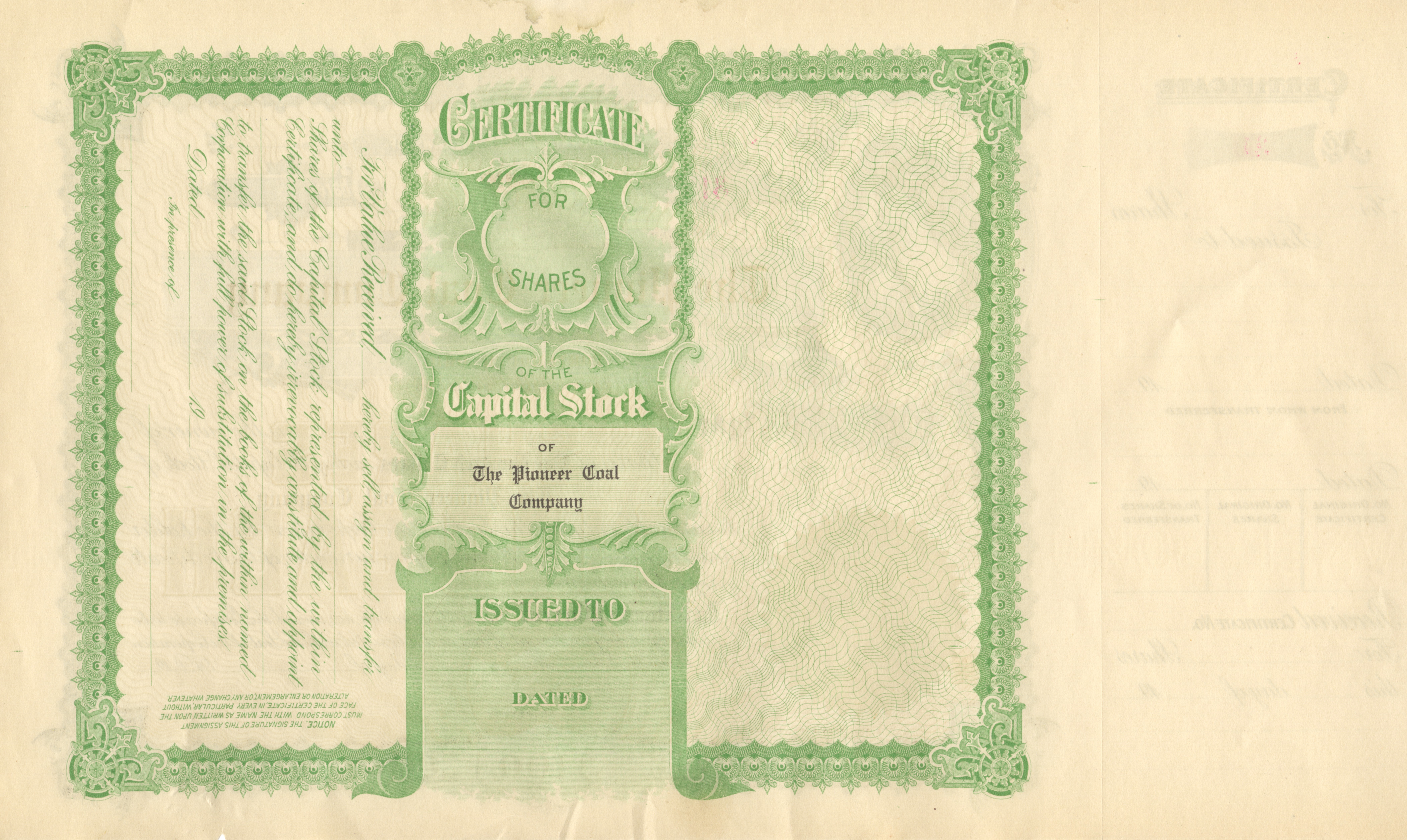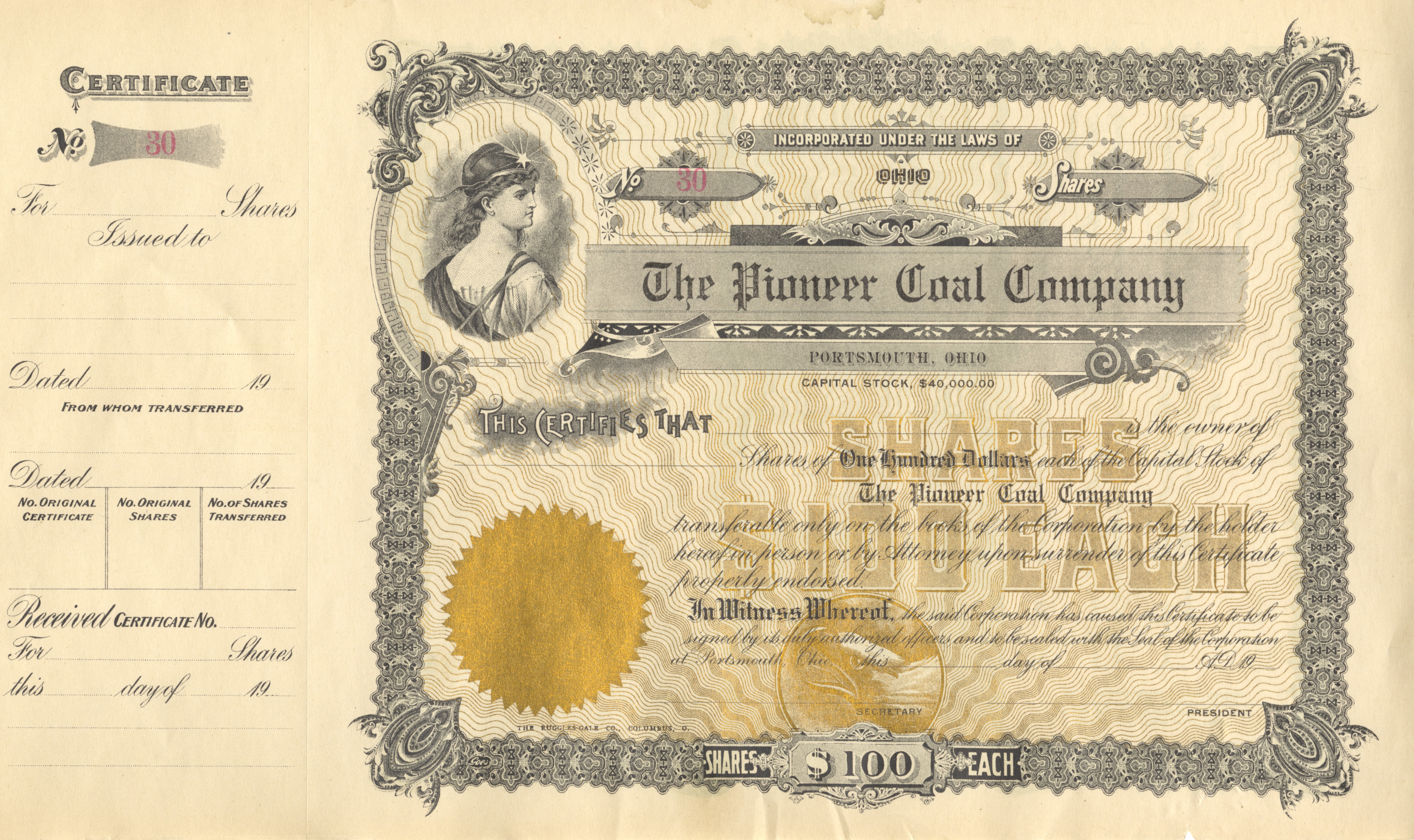 - Off-white stock certificate for Pioneer Coal--number 30 is designated on front (in red.) Black print and design on front; green print on back. Located 1137 12th (Twelfth). Undated and unsigned. Some damage--cut on left. The 1941 Portsmouth City Directory lists Della F. Maier as the owner and J.C. Derr as the manager.