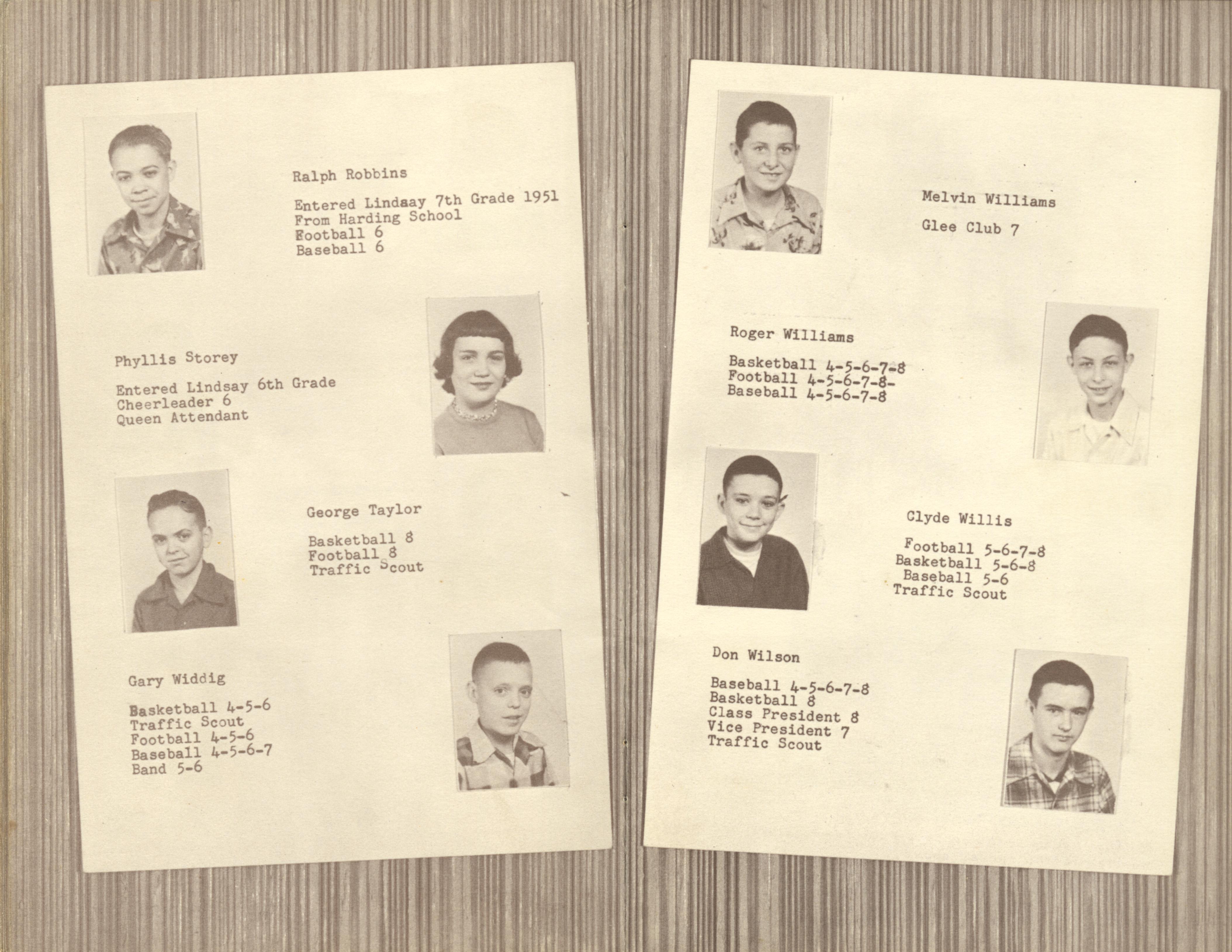 - Photo image of two Lindsay School yearbook pages. Starting on the left page, top to bottom: Ralph Robbins, Phyllis Storey, George Taylor, and Gary Widdig.