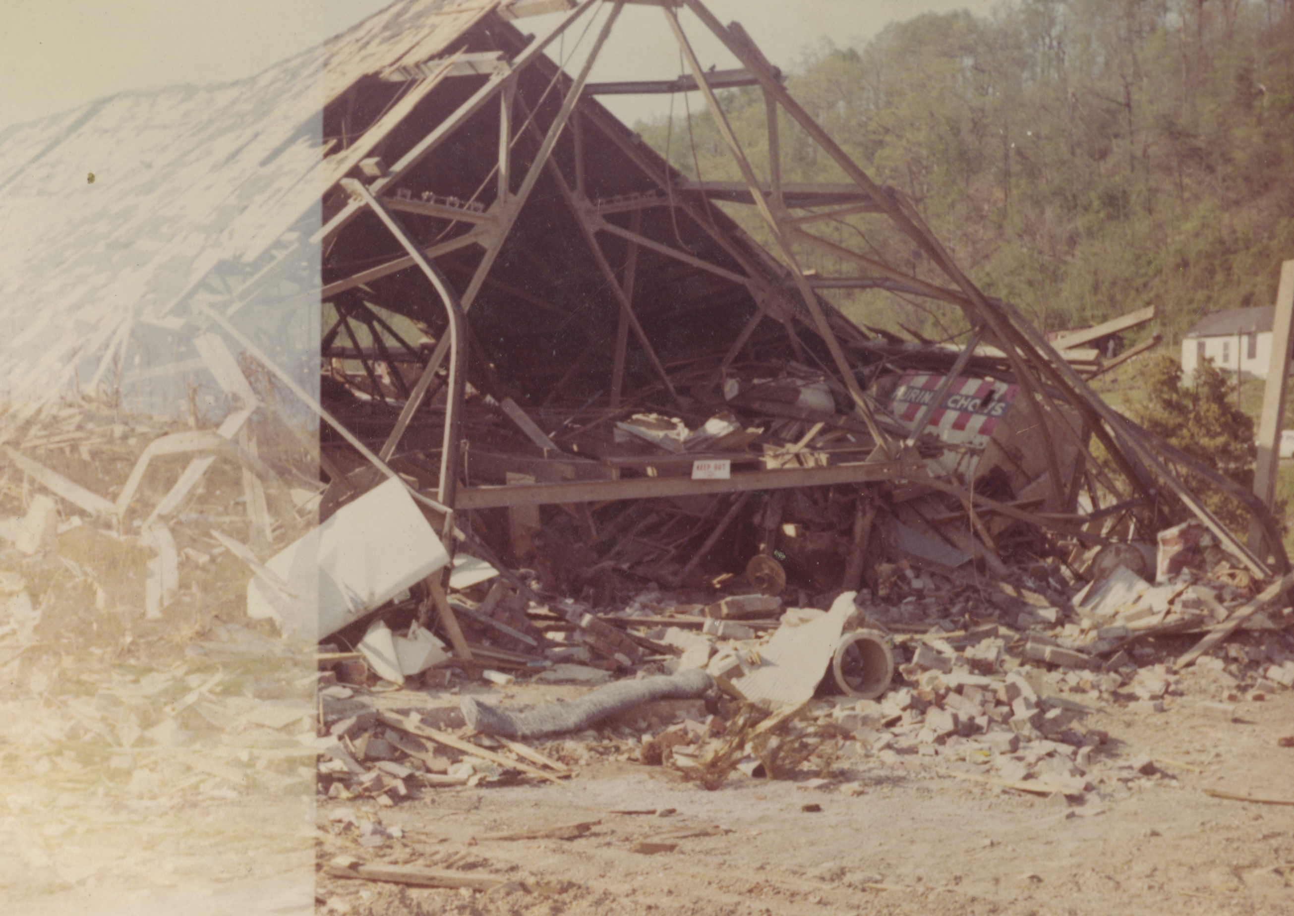- color scanned photo image of the aftermath of the tornado and the collapsed farm center
