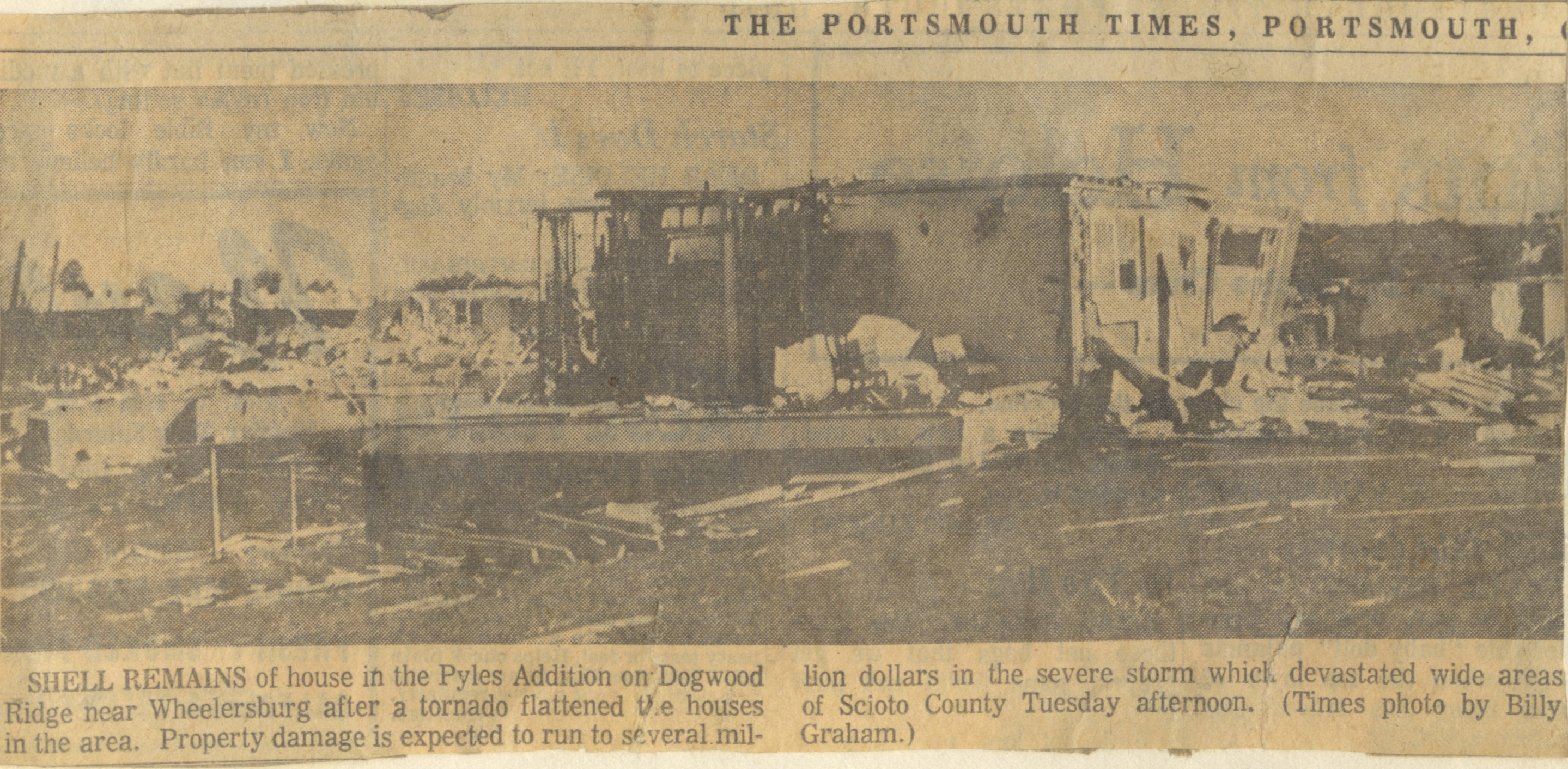 - Scan of an aged newspaper article about the remains of a destroyed house Pyles Addition during the Wheelersburg Tornado on Dogwood Ridge. Article also includes a photo of the destruction.