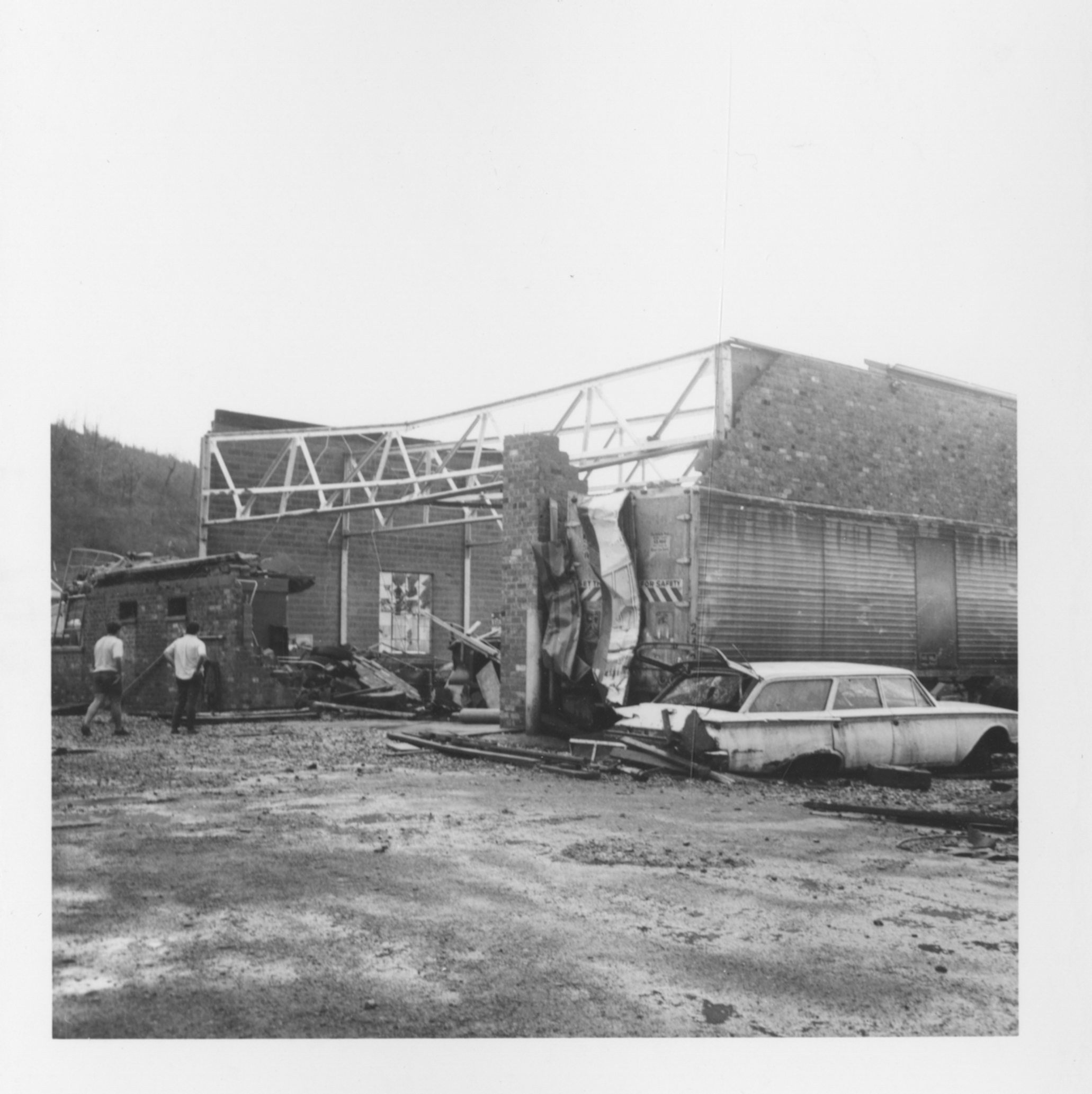 - Black and white photo image of the damage of Reinhardt's Transfer Company, located in Ohio River Road.