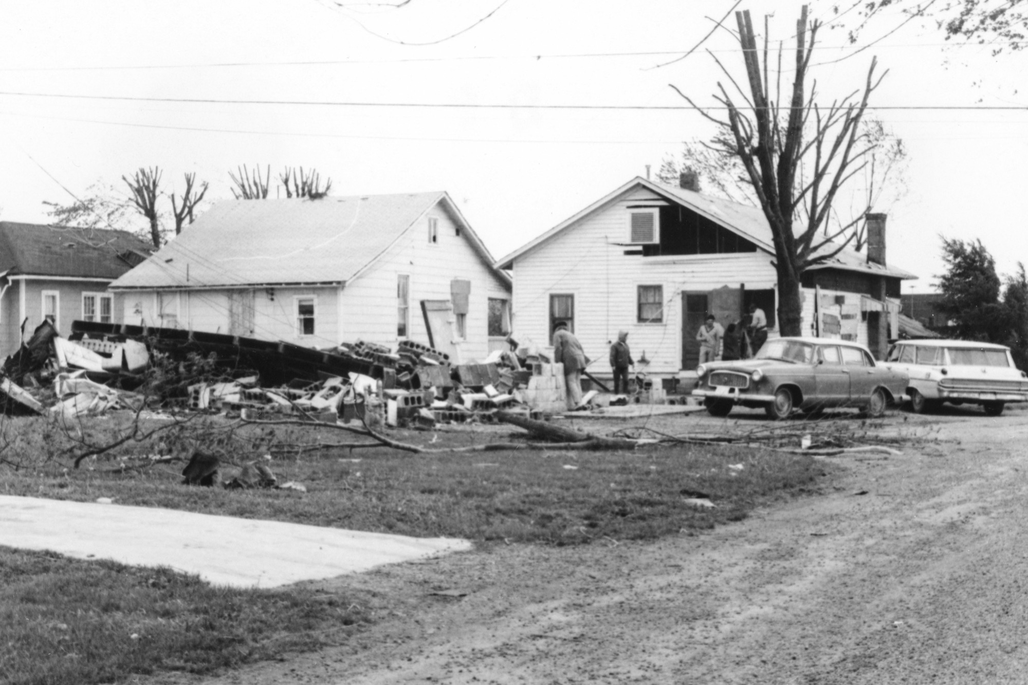 - Black and white photo image of unknown people picking through the rubble after the Wheelersburg tornado.