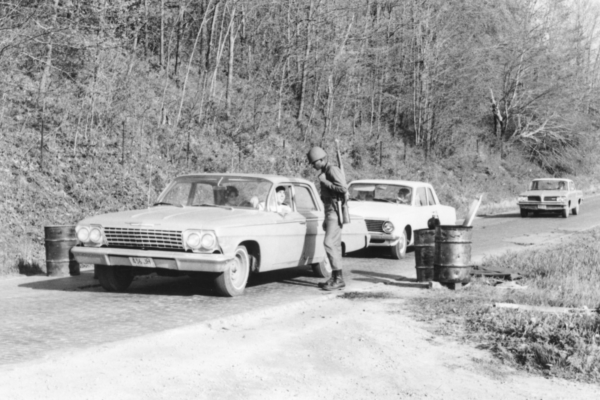 - Black and white photo image of the National Guard speaking with people at the checkpoint on Gallia Pike