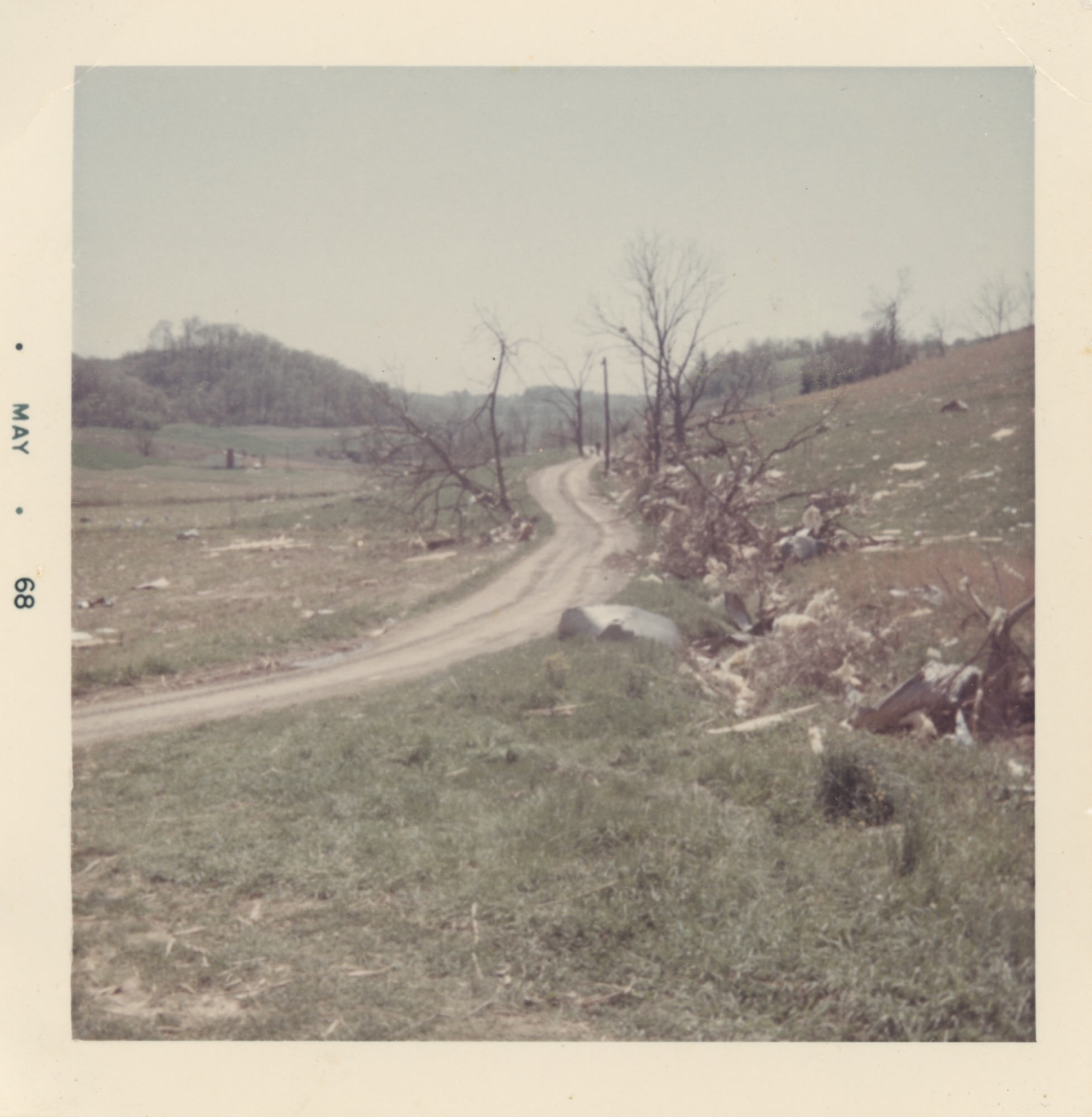 - Colorized photo image of the destruction on Sugar Camp Road after the tornado