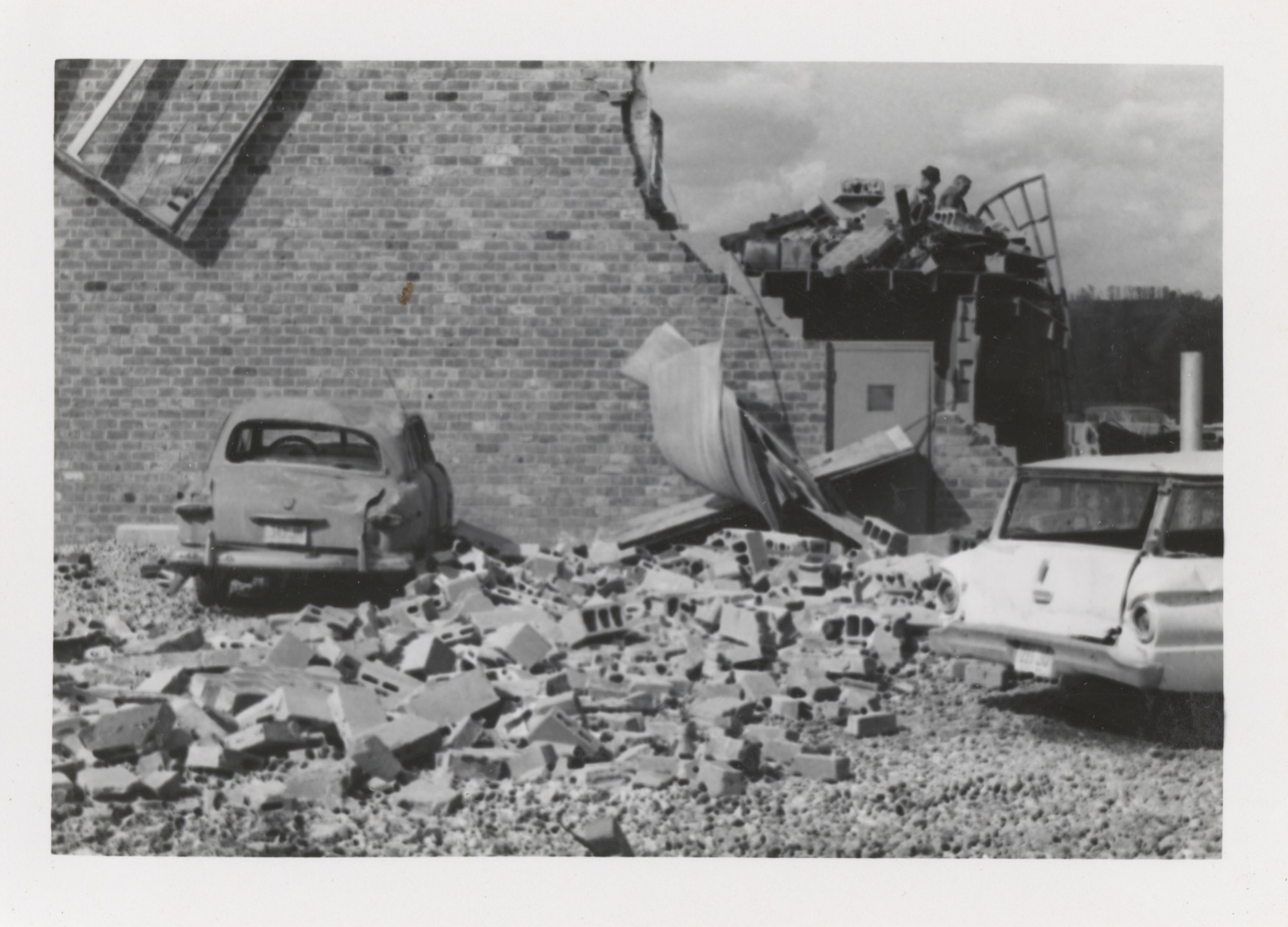 - Black and white photo image of the damage to Reinhardt's Transfer Company located on Ohio River Road