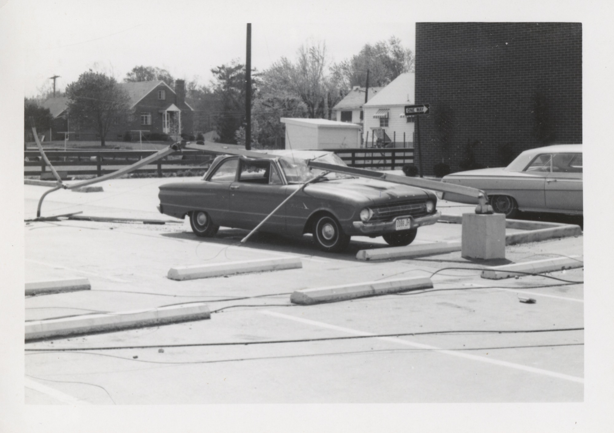 - Black and white photo image of the damage in the parking lot between the bank and Super Valu/Nancy Rae's in Wheelersburg