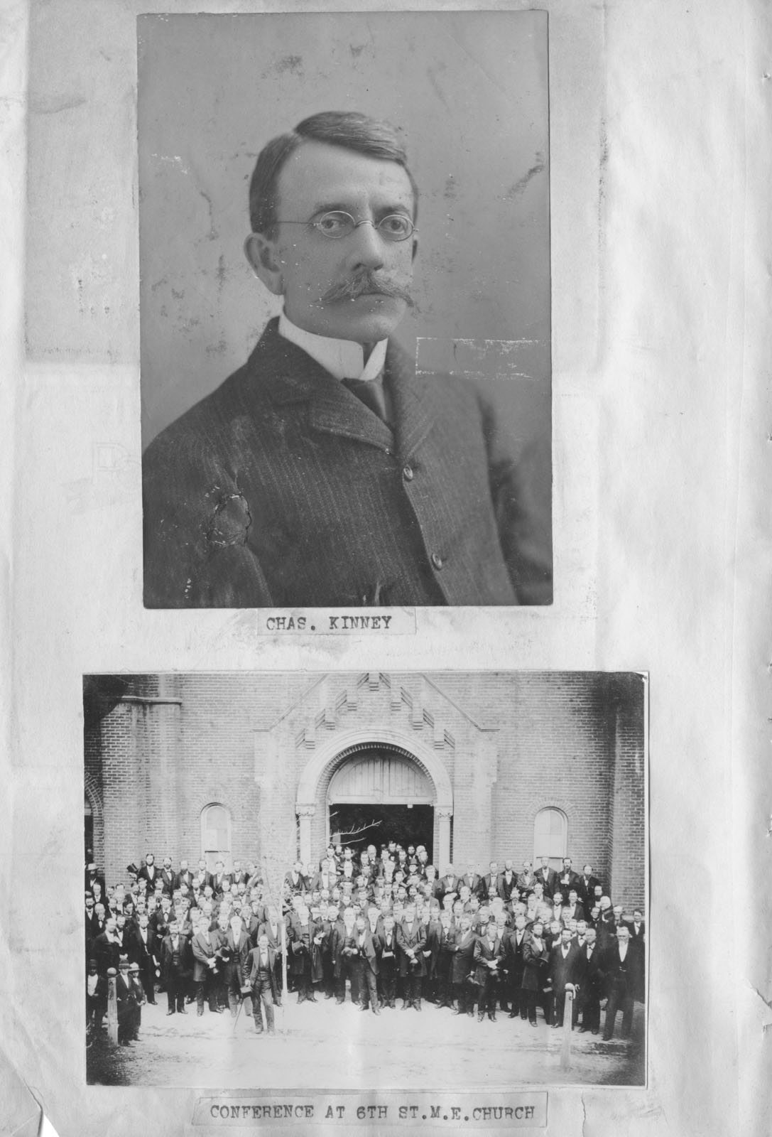 - Scanned unnumbered page from Henry A. Lorberg scrapbook containing black & white images of Charles Kinney and a Conference at 6th St. M.E. Church.