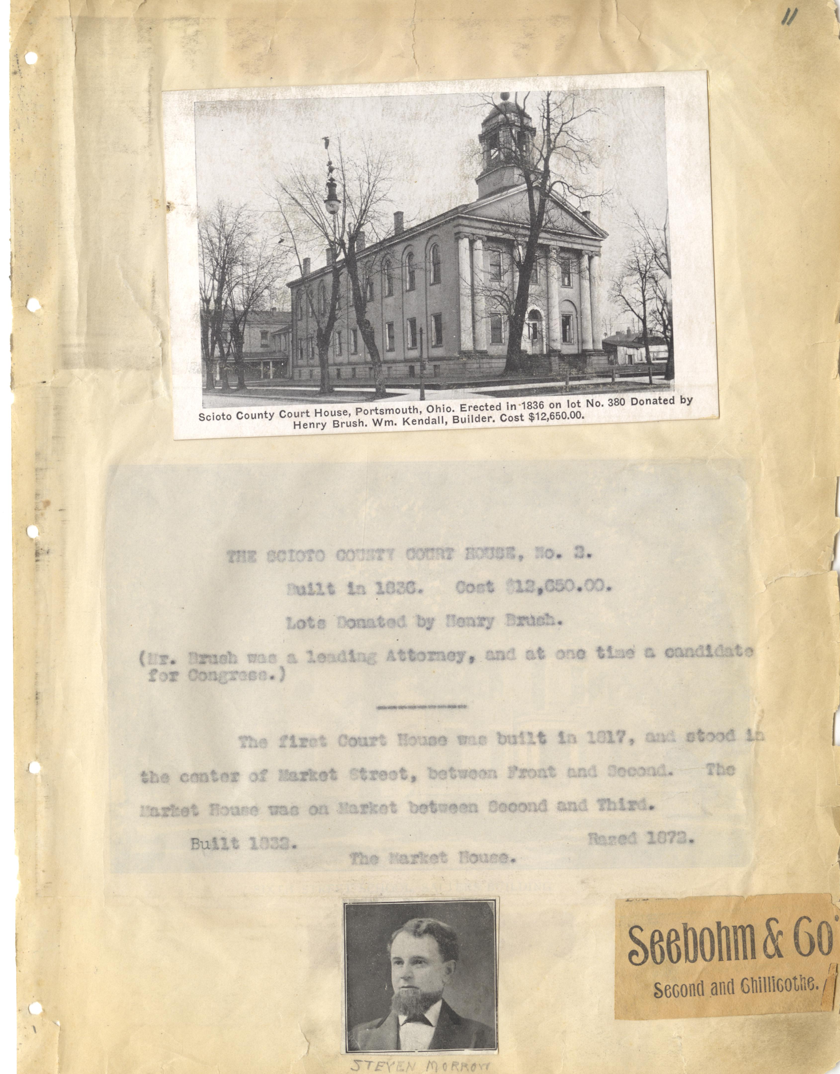 - Photo image of scanned scrapbook page: pictured is the Scioto County Courthouse with text underneath giving a brief history. This is actually the second courthouse. It was erected in 1836 and eventually razed in 1927.
