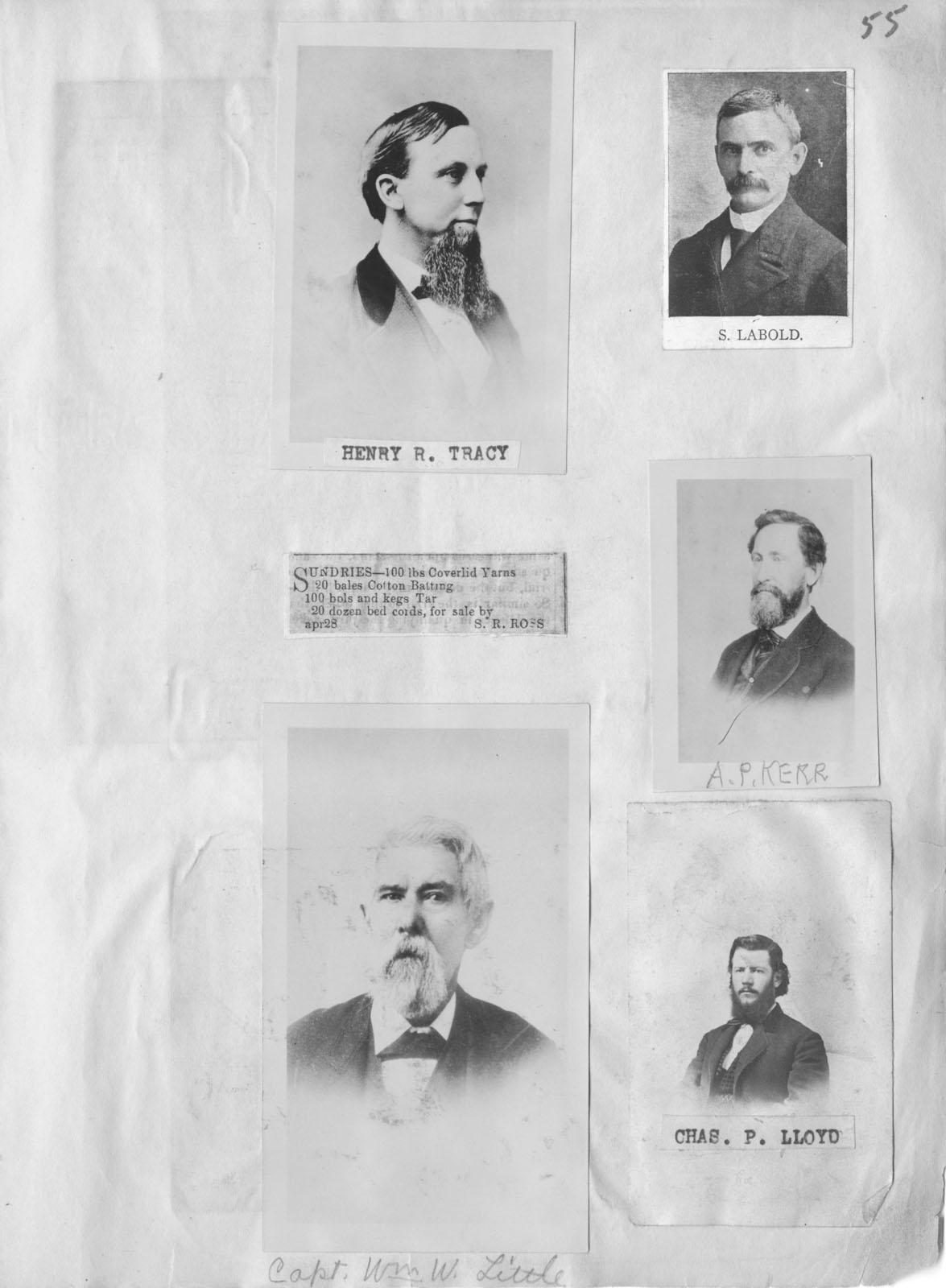 - Scanned page 55 from Henry A. Lorberg scrapbook containing black & white images of Henry R. Tracy; S. Labold (Simon Labold, president of the First National Bank); Captain William W. Little; A.P. Kerr; Charles P. Lloyd. Cutout of an ad for S.R. Ross Sundries.