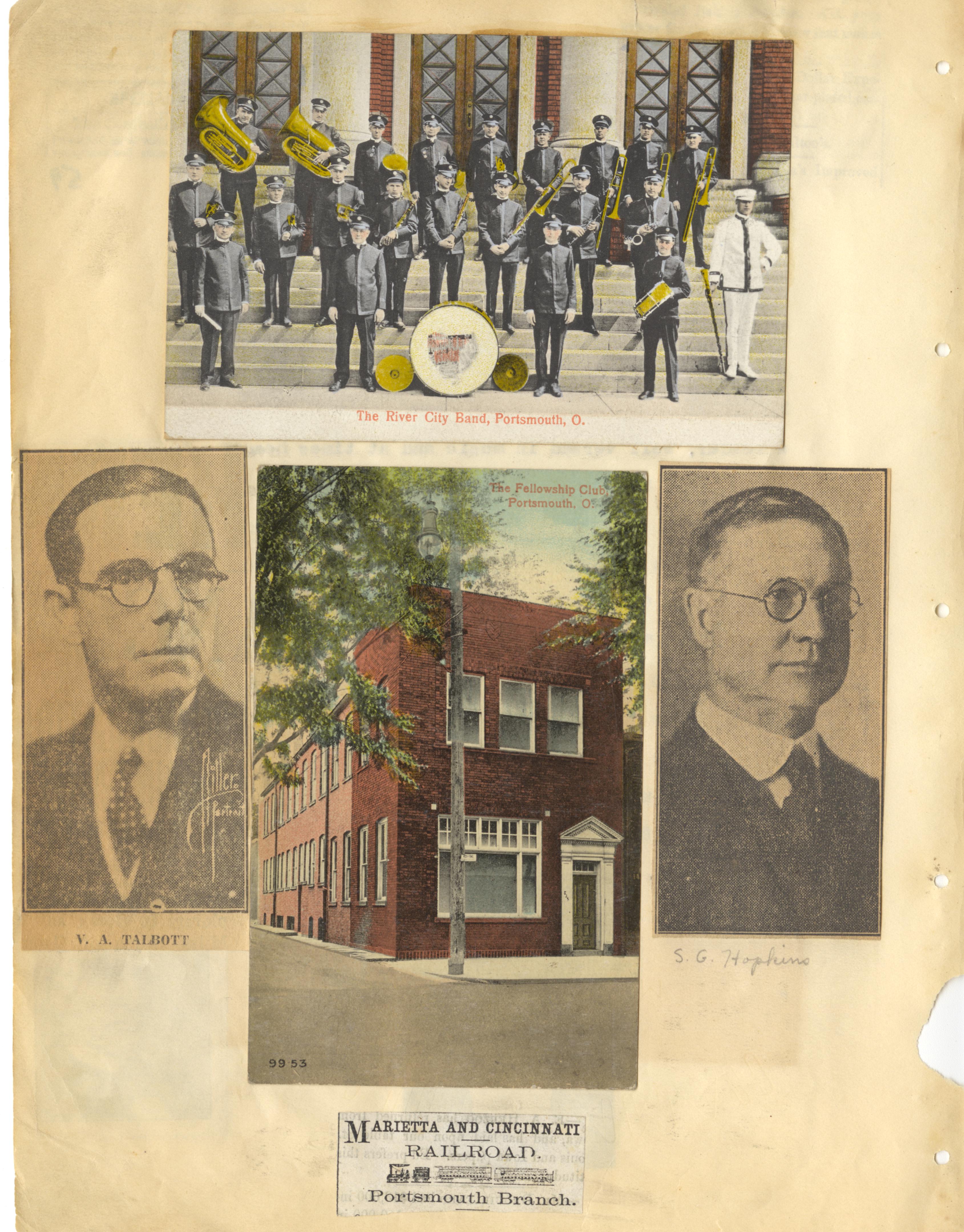 - Photo image of scanned scrapbook page: River City Band, V. A. Talbott, S. G. Hopkins, Fellowship Club at 825 Sixth Street, and Newspaper Ad for the Portsmouth Branch of the Marietta and Cincinnati Railroad